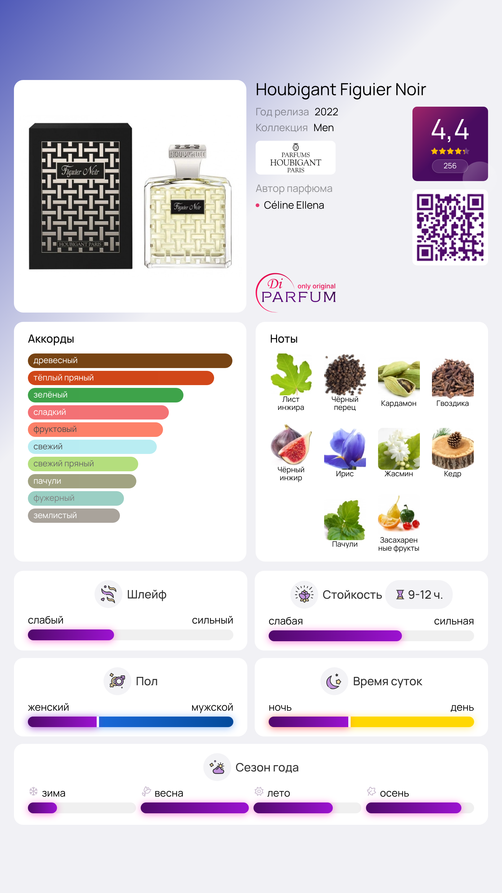 Figuier Noir от Houbigant — это мужской аромат, который был выпущен в 2022 году. Парфюмером, создавшим этот удивительный аромат, является Селин Эленна. В верхних нотах можно уловить свежесть листьев инжира, черного перца, кардамона и гвоздики, в сердце композиции раскрываются черный инжир, ирис и жасмин, а базой служат такие ноты, как инжир, кедр, пачули и засахаренные фрукты.