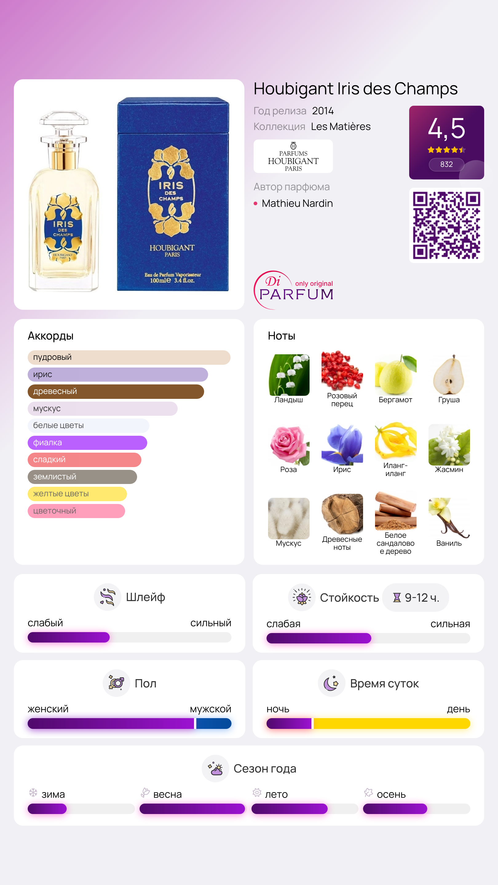 Аромат Iris des Champs от французского парфюмерного дома Houbigant рассказывает историю восточных цветов, где главенствующее место занимает ирис. Прелюдия с бергамотом, розой, ландышем, грушей и розовым перцем плавно переходит в пудровую ноту ириса, которую дополняют жасмин и иланг-иланг. Базовые ноты амбры, древесины, сандала, ванили и мускуса создают основу для этого цветочного шедевра.