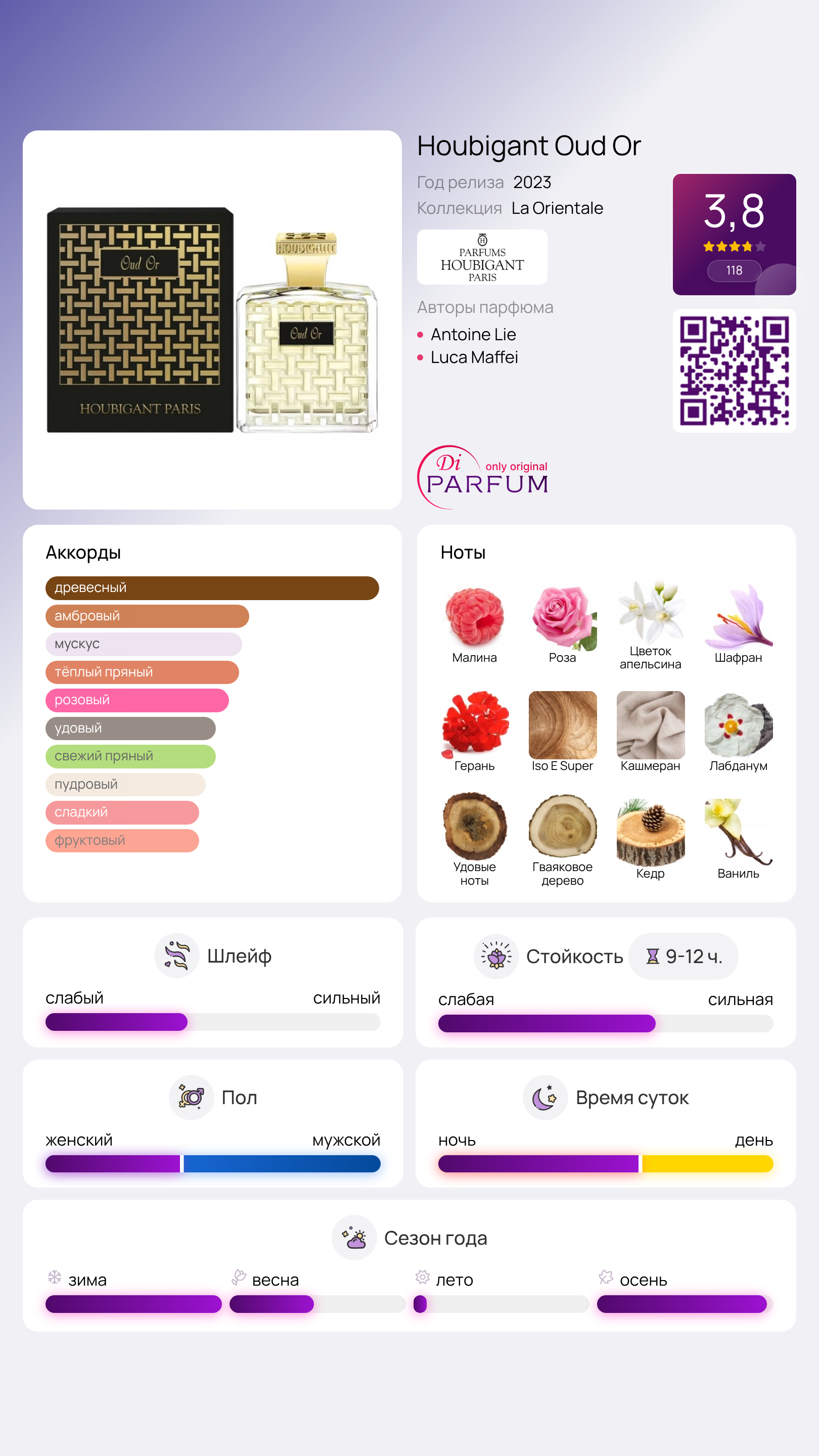 Аромат наполнен экологически чистыми и качественными ингредиентами, что придаёт ему уникальную стойкость. Он станет идеальным спутником как для романтических встреч, так и для повседневных дел. Oud Or — это не просто парфюм, это путешествие через века, в сердце культуры и искусства, которые вдохновляют на протяжении всей жизни.