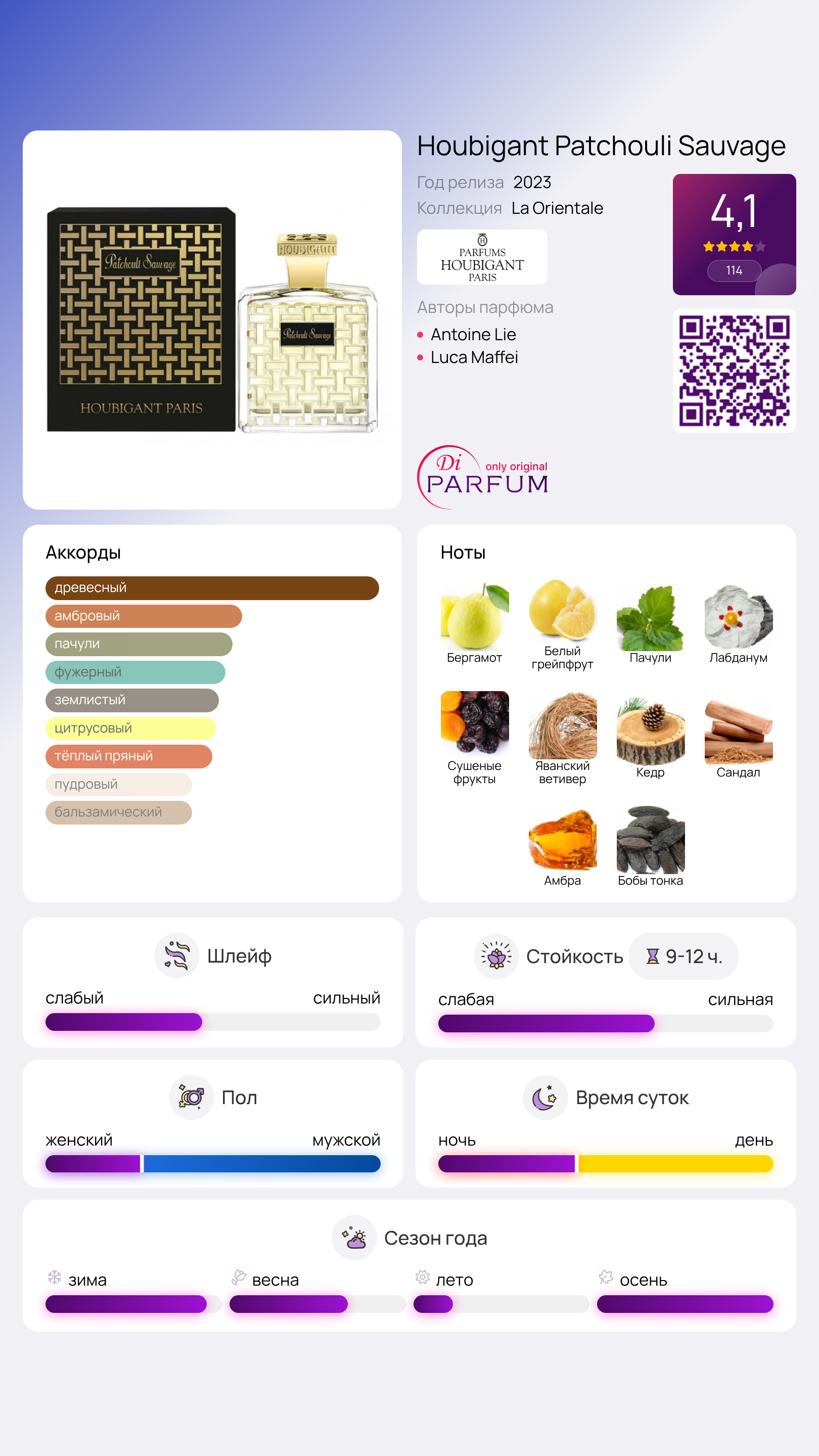 Patchouli Sauvage от Houbigant – это унисекс аромат, который был представлен в 2023 году. Создатели этого произведения искусства – парфюмеры Лука Маффеи и Антуан Ли. В его композиции можно выделить яркие верхние ноты бергамота и белого грейпфрута, которые плавно переходят в сердце из пачули, лабданума и сухофруктов. Завершающими аккордами являются ноты кедра, масла яванского ветивера, сандала, амбры и стручков тонка.
