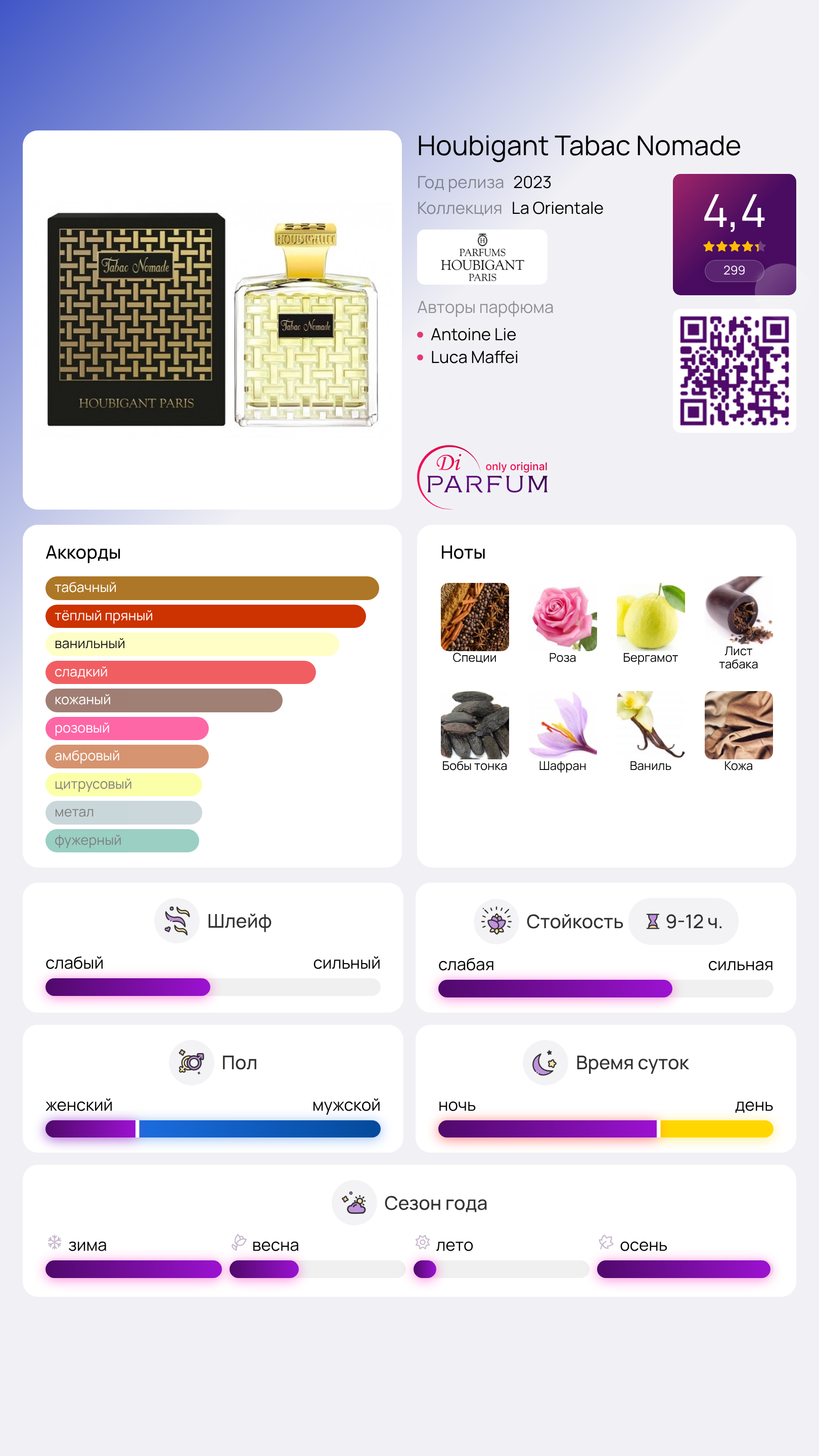 Tabac Nomade от Houbigant — это уникальный аромат, предназначенный как для женщин, так и для мужчин. Этот новый парфюм debuted в 2023 году и был создан талантливыми парфюмерами Лука Мафеи и Антуаном Ли. В его композиции открывающие ноты включают специи, розу и бергамот, сердечные ноты представлены табачным листом, бобами тонка и шафраном, а в базе звучат ваниль и кожа.