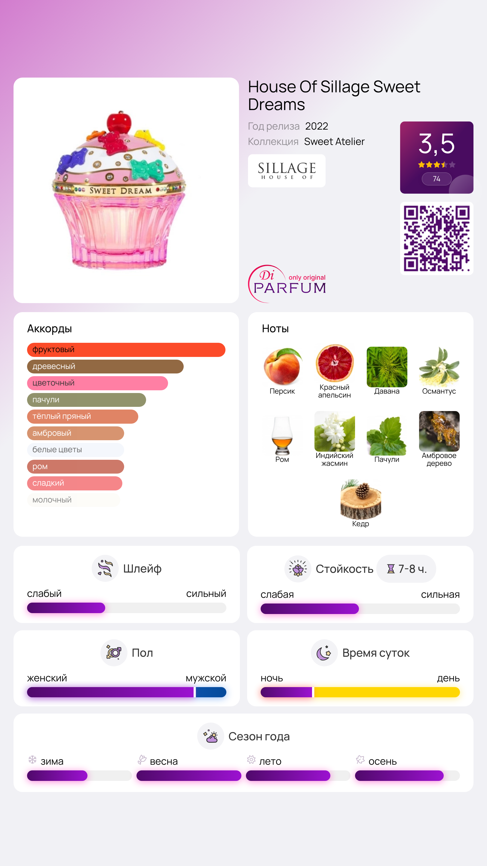 Аромат House Of Sillage Sweet Dreams создан для тех, кто обожает сладости и нежные штрихи. Этот парфюм точно подарит вам удовольствие, не добавив лишних калорий. В своем ярком составе он сочетает цитрусовые ноты мандарина, теплые от солнца персики и густые цветочные аккорды. Капля рома придает этому аромату загадочность, а нотки карамели и чувственные аккорды жасмина и роз погружают в атмосферу нежности.