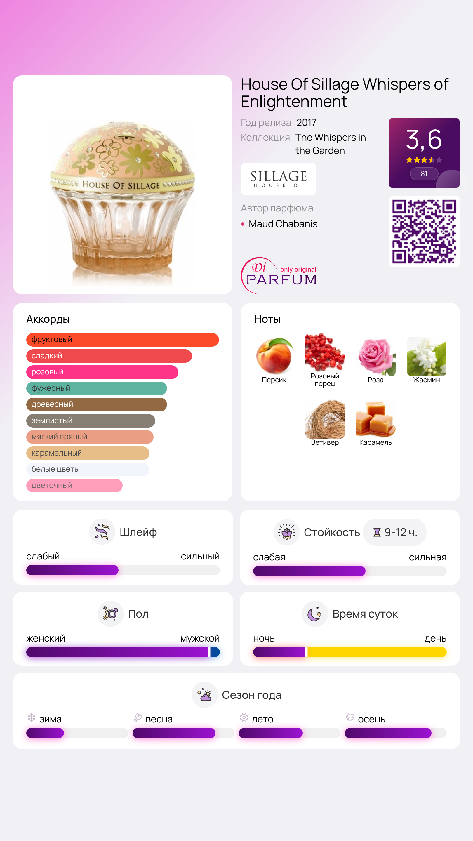 Whispers of Enlightenment от House Of Sillage — это шикарный цветочно-фруктовый гурманский аромат для женщин. Выпущенный в 2017 году, этот парфюм создан талантливым парфюмером Maud Chabanis. В его композиции гармонично сочетаются ноты розового перца и персика в верхних аккордах, изысканные ноты розы и жасмина в сердце, а также глубокие и уютные базовые ноты ветивера и карамели.