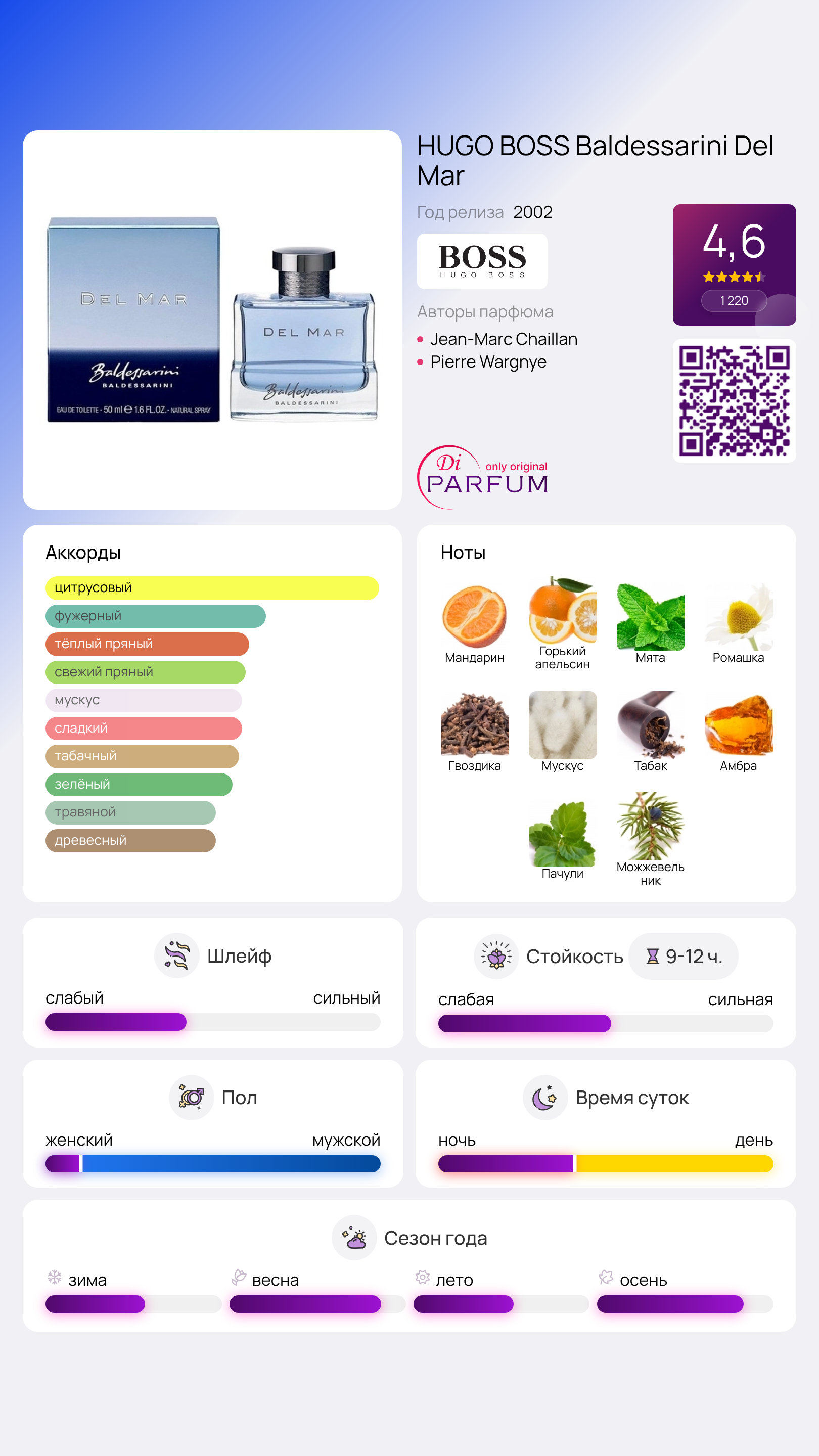Стильный мужской парфюм Baldessarini Del Mar от Hugo Boss символизирует мощь и энергетику моря. Этот аромат приглашает к захватывающим приключениям и необыкновенным путешествиям, предлагает наслаждение отдыхом на роскошной яхте и эмоции от активных видов спорта. Он приносит освежающий морской ветер и предостерегает от приближающихся штормов. Владелец данного аромата с уважением принимает все дары океана, ведь он ощущает себя в гармонии с природой.