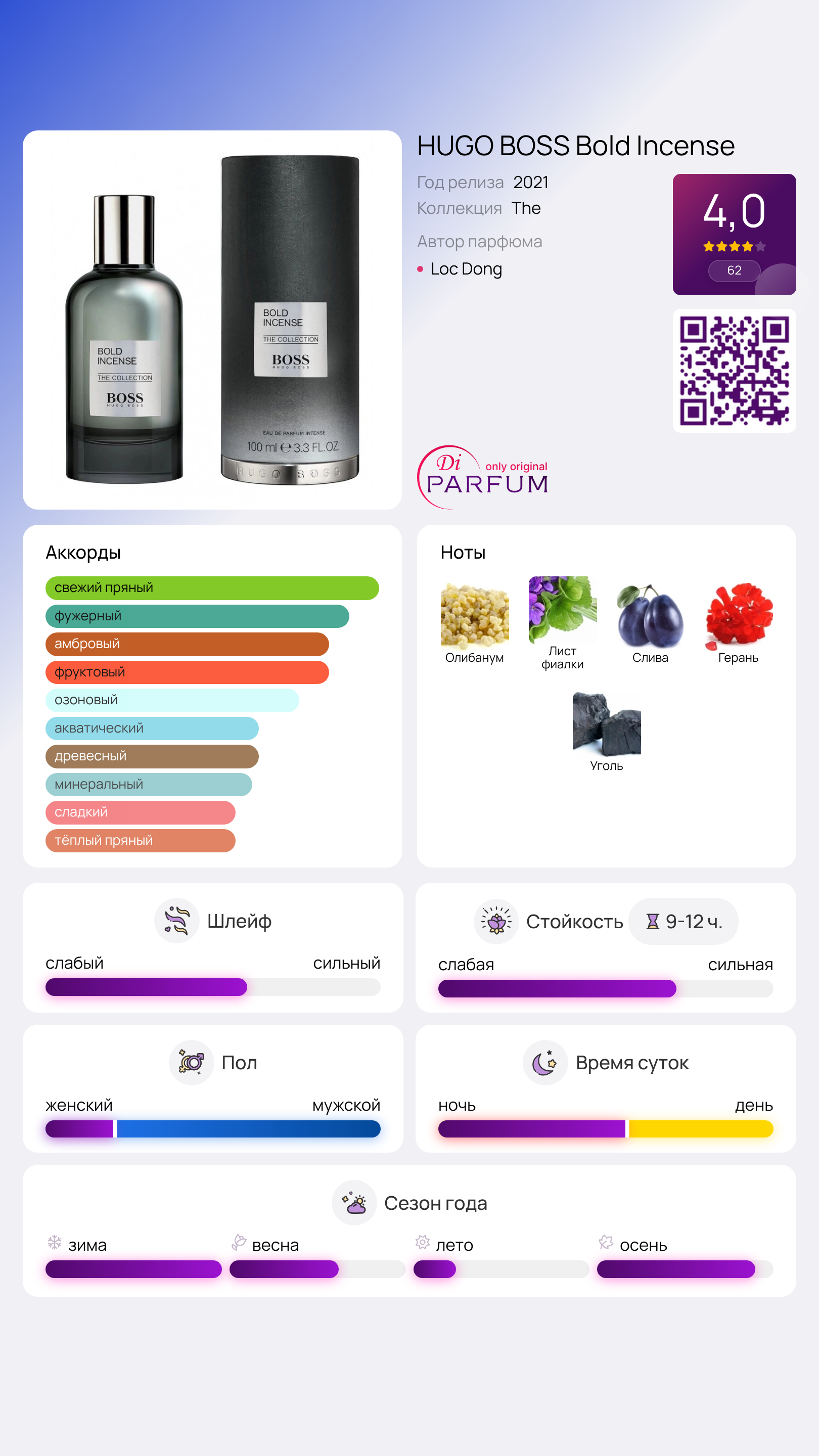 The Collection Bold Incense от Hugo Boss представляет собой ароматический фруктовый парфюм для мужчин, выпущенный в 2021 году. Создателем данного аромата является парфюмер Loc Dong, известный своим умением сочетать необычные ноты и создавать уникальные композиции.