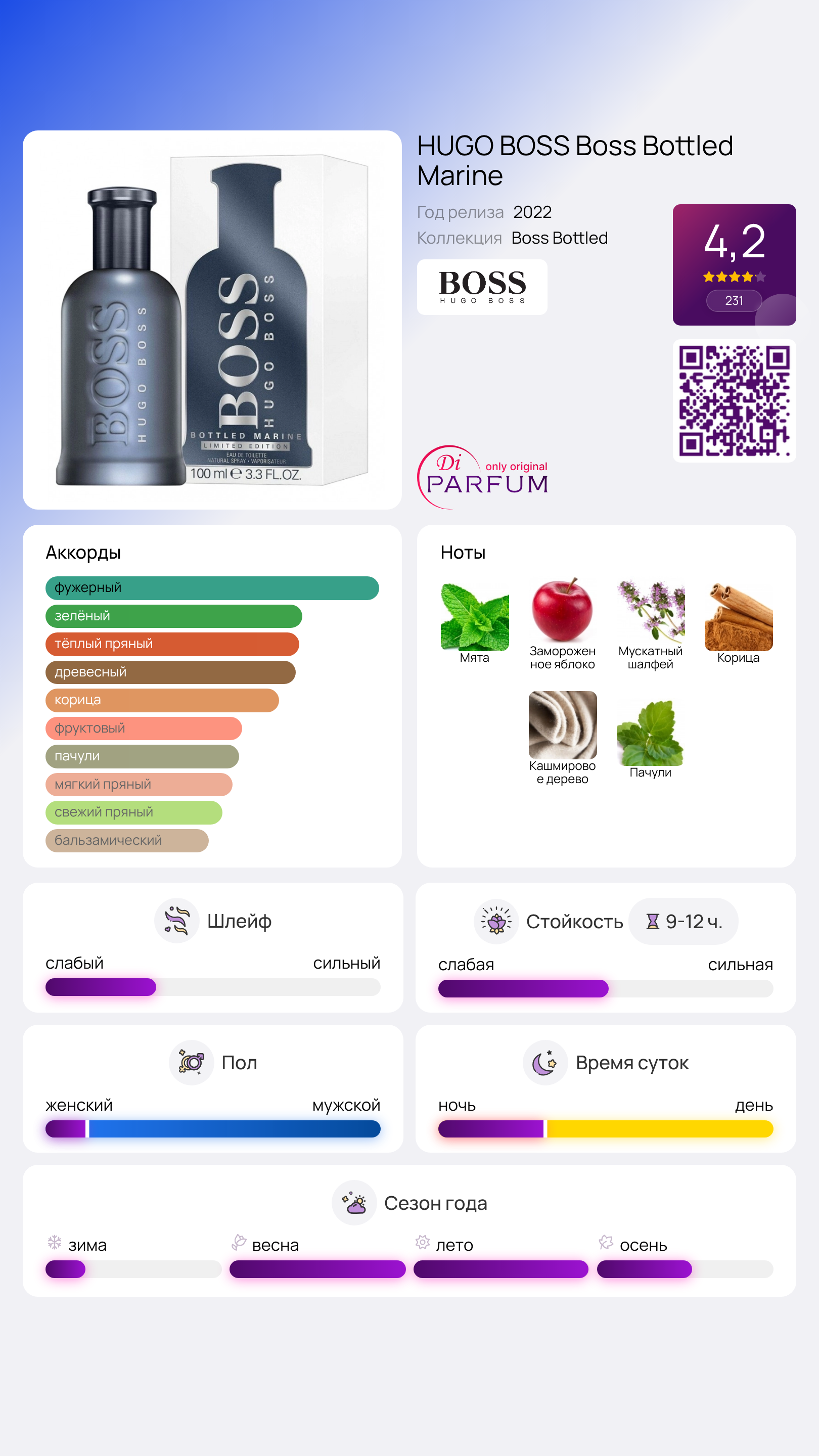 А вот акватически-озоновая начинка, когда-то холодная, уступила место новым мужским качествам. Теперь в базе HUGO BOSS Boss Bottled Marine усиливается ощущение силы и мужественности благодаря терпкому дымному аромату пачули и мягкому, древесному акценту кашмерана.
