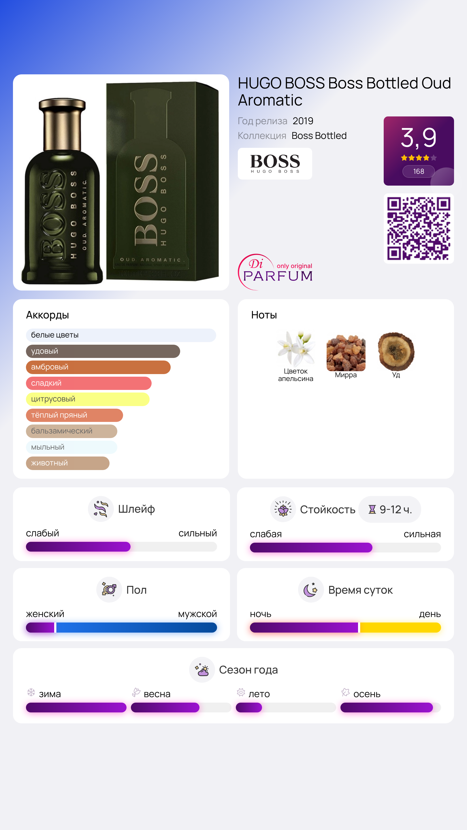 Boss Bottled Oud Aromatic – это удивительный парфюм, представленный в 2020 году брендом HUGO BOSS. Эта эксклюзивная ароматическая композиция погружает в мир восточно-цветочных нот, выделяясь динамичностью своей центральной мелодии и изысканным, нежным послевкусием.