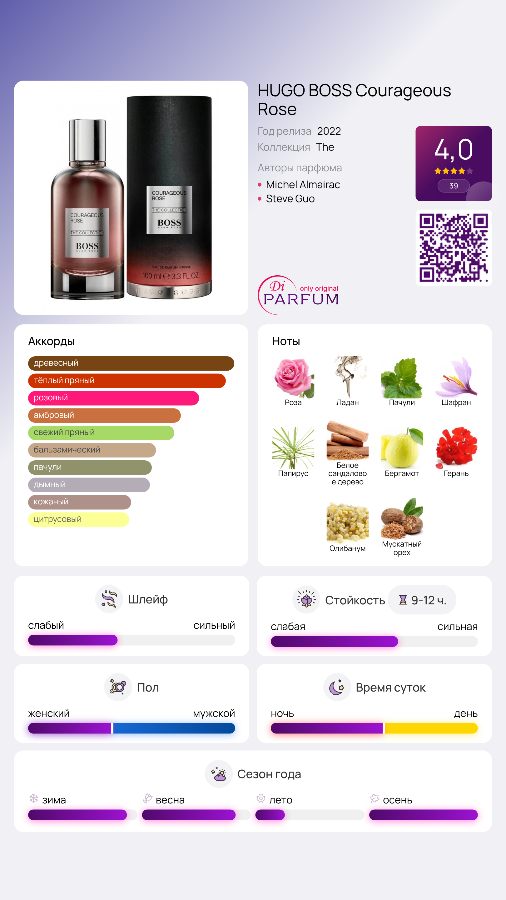 Стоит отметить, что Courageous Rose идеально подходит для современных мужчин, ценящих стиль и уверенность. Этот парфюм станет отличным выбором как для повседневного использования, так и для особых случаев.
