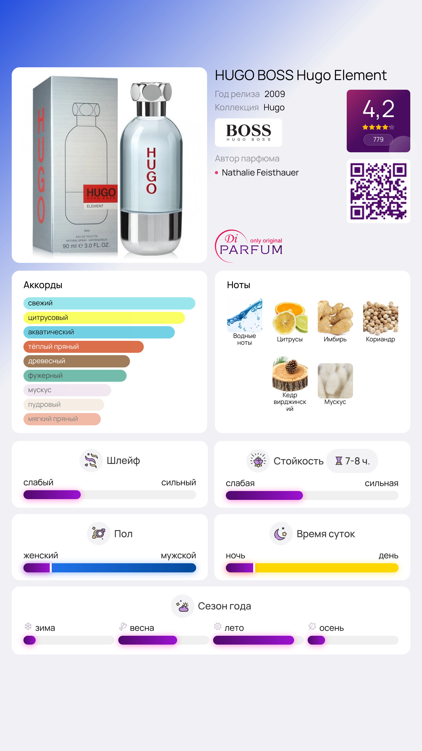 Уникальные мужчины заслуживают уникальных ароматов. Hugo Element предназначен для молодых, динамичных и уверенных в себе людей, готовых встретить будущее с оптимизмом. Такой человек - истинный городской житель, который осознает свои стремления и знает, как их реализовать. Его не интересуют мелкие выигрыши; он ориентирован на серьезные достижения и понимает, что для этого нужно действовать решительно.