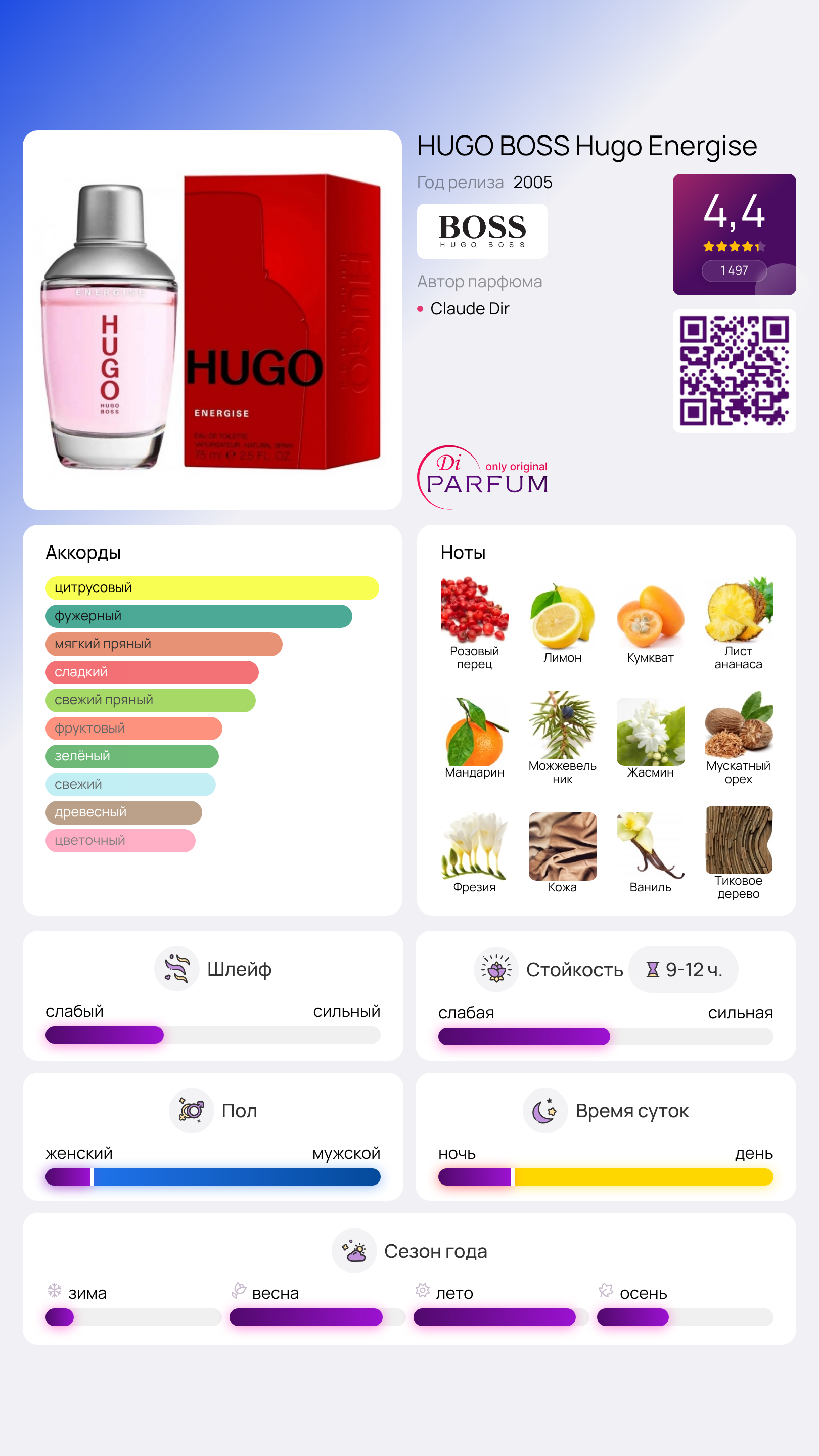 Сложная многогранная композиция Hugo Energise начинает свое раскрытие с ярких верхних нот розового перца, мандарина, кумквата, дыни и кардамона. В центре аромата звучат легкие ноты кориандра, белой фрезии, ягод можжевельника и семян гибискуса. Завершает этот богатый букет смешение индийского сандала, древесины джакаранда, замши и черного какао.