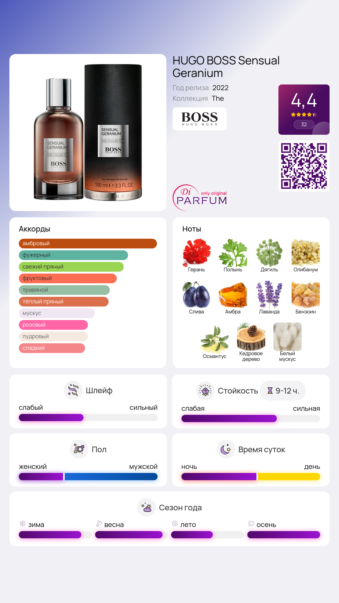 Аромат принадлежит к цветочным, древесным и амбровым семействам, что делает его универсальным выбором для любого времени года. Если вы ищете что-то, что подчеркнет вашу индивидуальность и оставит незабываемое впечатление, Sensual Geranium - отличный выбор.