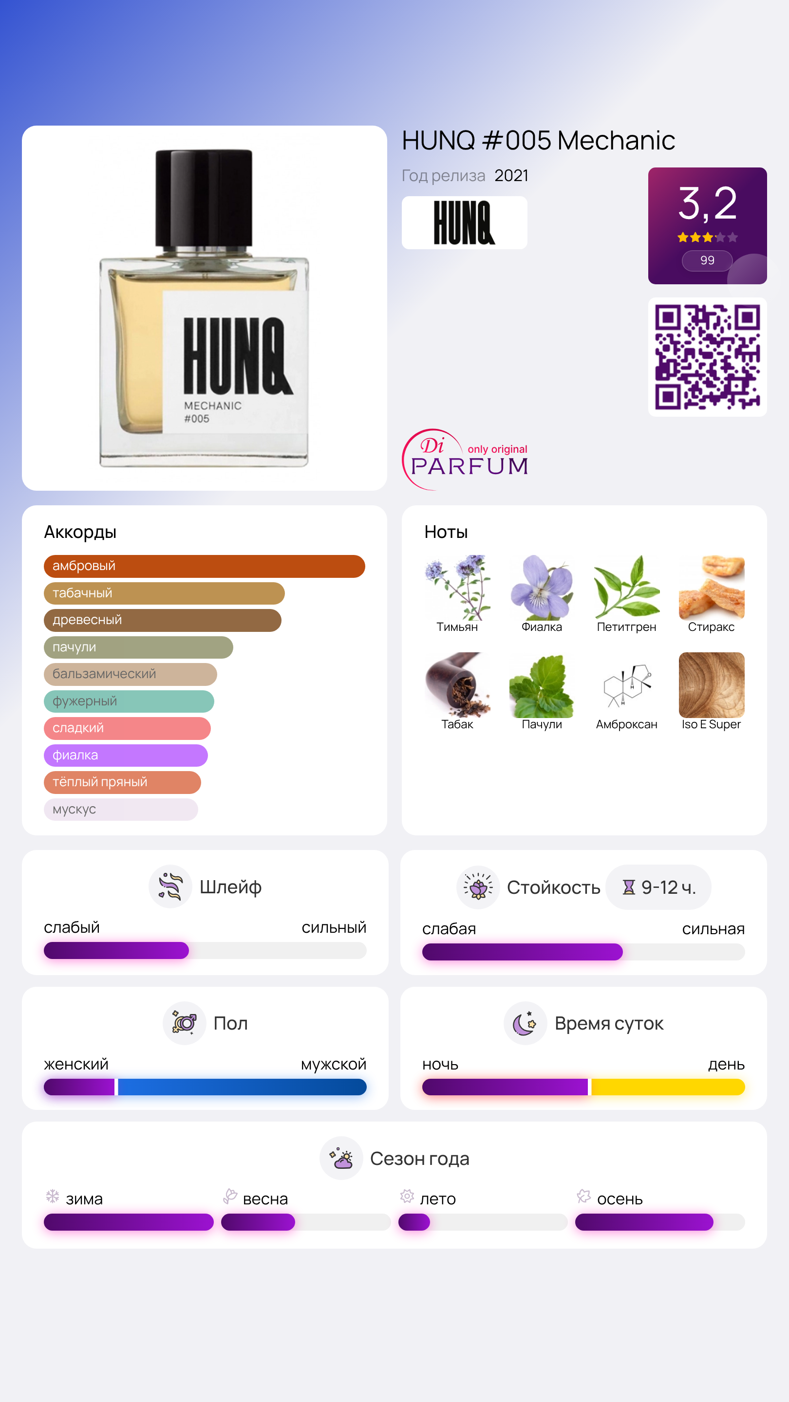 Ключевым элементом композиции является современная молекула iso e super. Запах #005 Mechanic от HUNQ был представлен в 2021 году на выставке Pitti Fragranze во Флоренции. Кампания по продвижению аромата включала пятерых молодых обнаженных мужчин, что является переводом названия марки из Нидерландов. Каждый из них олицетворяет разные профессии, вдохновленные известными фильмами. Данная парфюмерная вода вышла в рамках коллекции, состоящей из пяти ароматов, посвященных стихиям, элементам природы и мужским архетипам.