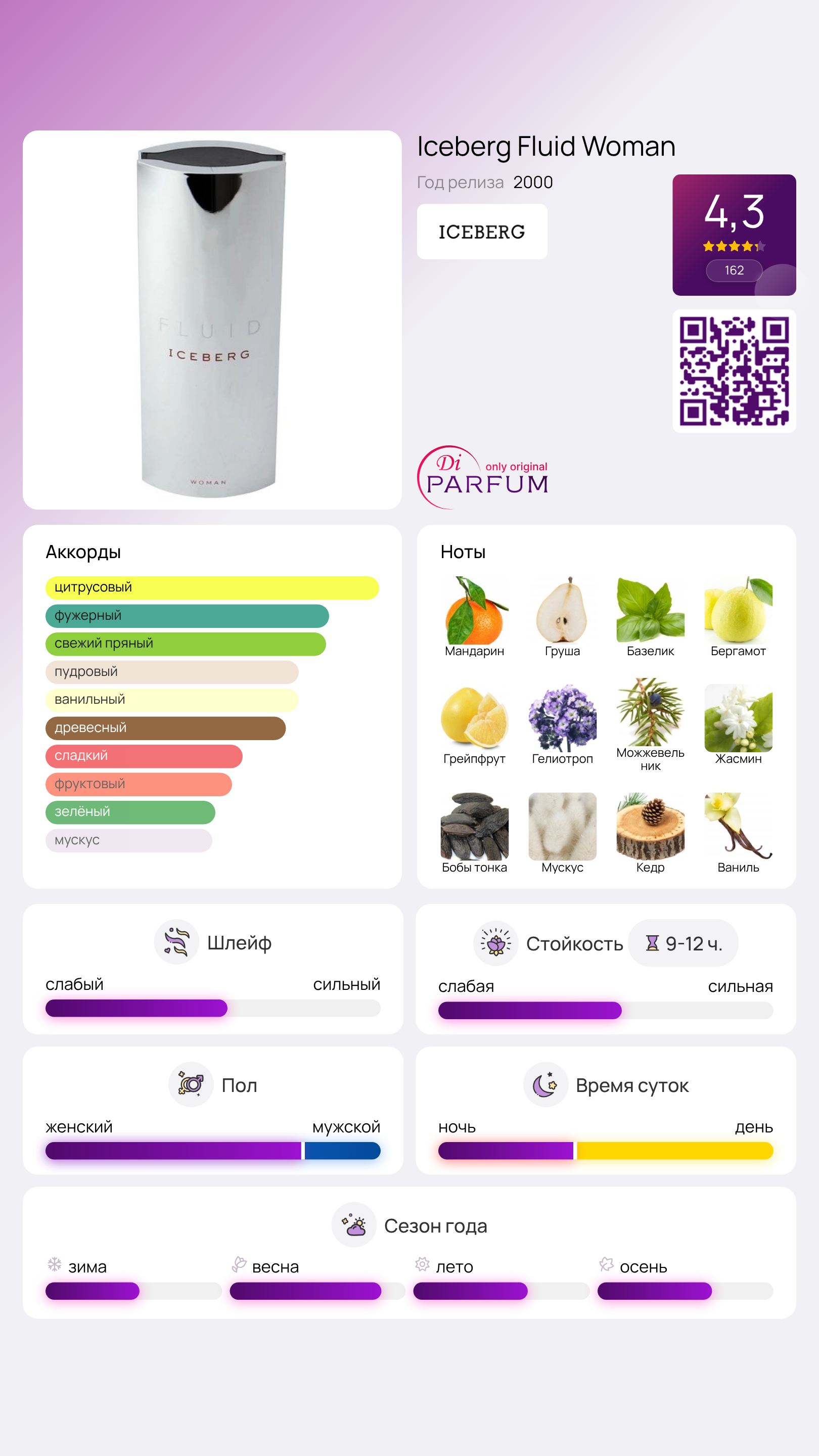 Парфюм Fluid Woman олицетворяет стиль и изысканность с первых аккордов цитрусовых. В сердце слились ароматы гелиотропа, жасмина и можжевельника, придавая композиции изысканность. Завершает этот аромат богатая база из древесных и мускусных нот. Этот парфюм, созданный в далеком 2000 году, подчеркнет как ваш облик бизнес-леди, так и образ романтичной девушки.