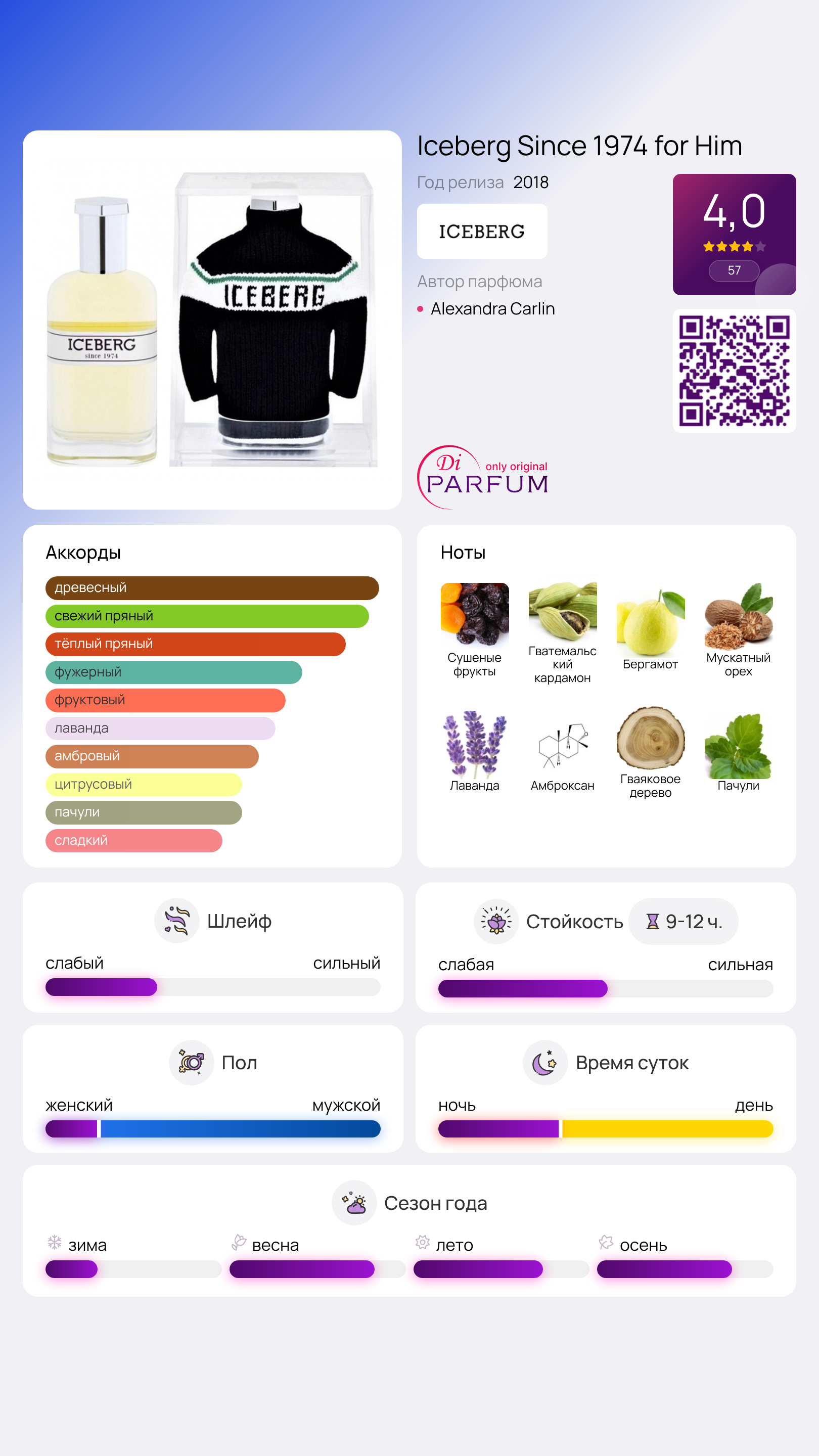 Упаковка этого аромата выделяется своей оригинальностью — матовый флакон и блестящая крышка дополнены вязанным мужским свитшотом с логотипом "Айсберг". Аромат самого парфюма также необычен и увлекателен. Свежий бергамот, пряный кардамон, аромат солнцем освеженных сухофруктов, густое облако мускатного ореха и завершающие ноты соблазнительного амброксана, пачули и гуавы создают гармоничный и уникальный шлейф.