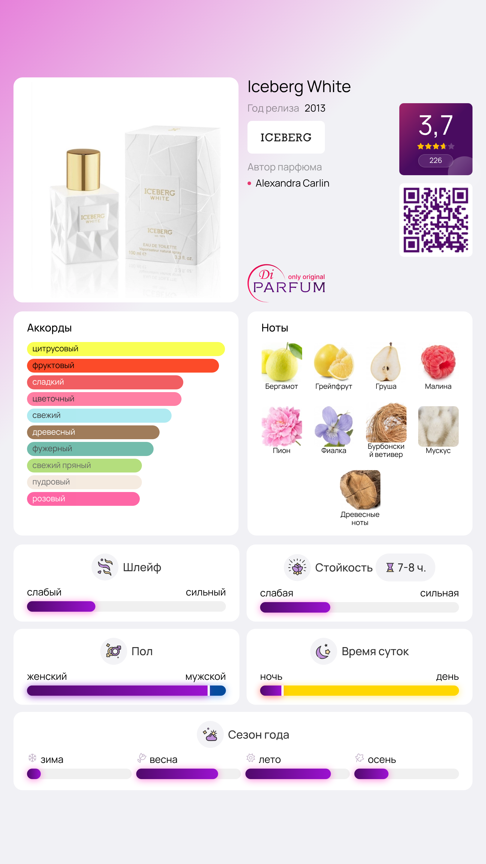 Iceberg White - это символ чистоты и женственности от итальянского бренда Iceberg. Этот изысканный парфюм был выпущен в 2013 году и призван подчеркнуть природную красоту женщин. В его композиции присутствуют яркие цитрусовые ноты лимона и грейпфрута, сдобренные сладостью малины и груши. В сердце аромата расцветают пион и фиалка, придающие композиции нежность и чувственность. А завершают этот букет аккорды светлого дерева, мускуса и горьковатого ветивера бурбон.
