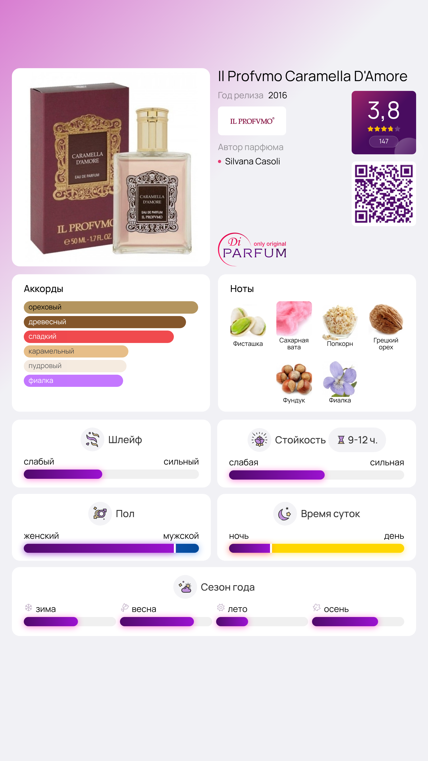 Аромат Caramella D'Amore от Il Profvmo призван передать уникальные эмоции материнской любви, которые сопровождают детство, юность и зрелость. В каждой ноте этого аромата звучит нежность и тепло, плетется мотив воспоминаний и нежных чувств. В нем таится особая магия с дымкой воспоминаний и ореолов вдохновения.
