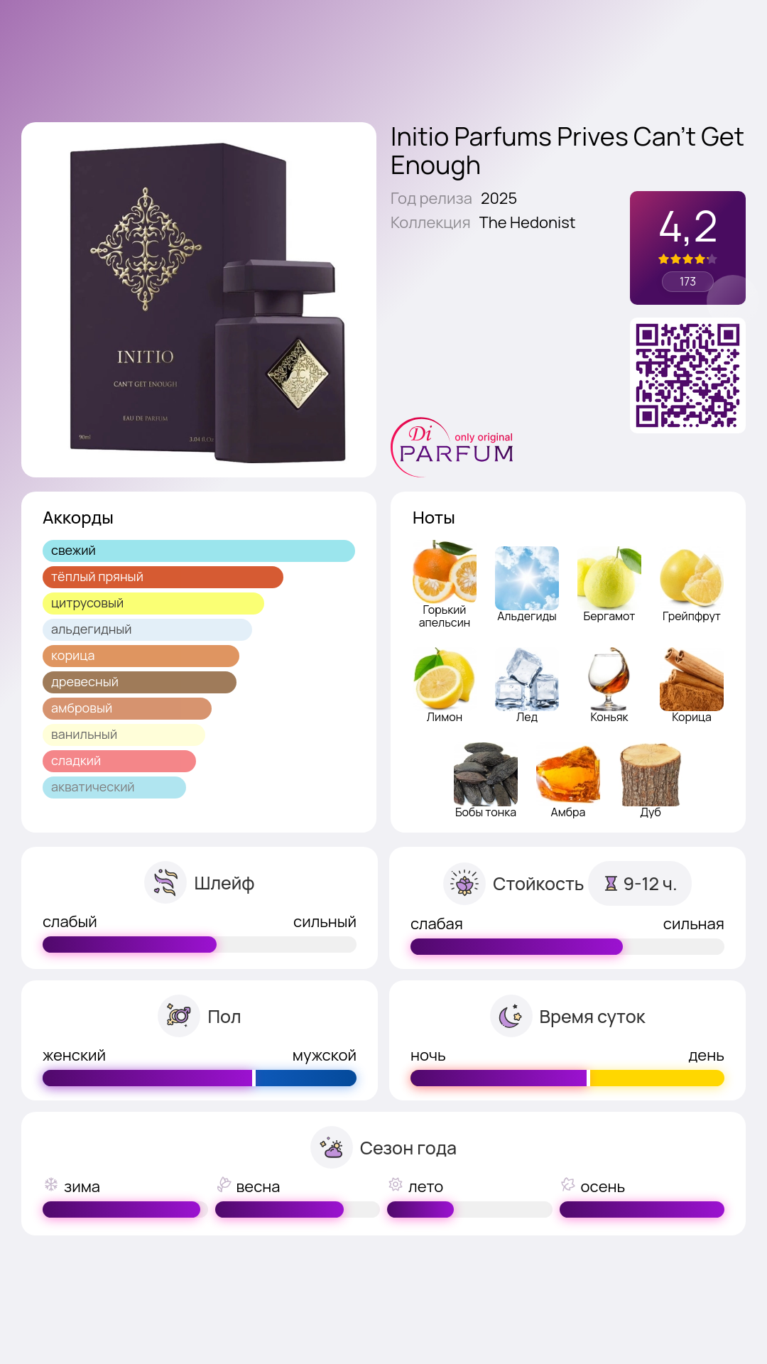 Изюминка Can't Get Enough заключается в его способностях трансформироваться от свежей и взрывной начальной ноты к теплой и уютной базе, что делает его универсальным выбором для любого времени года.