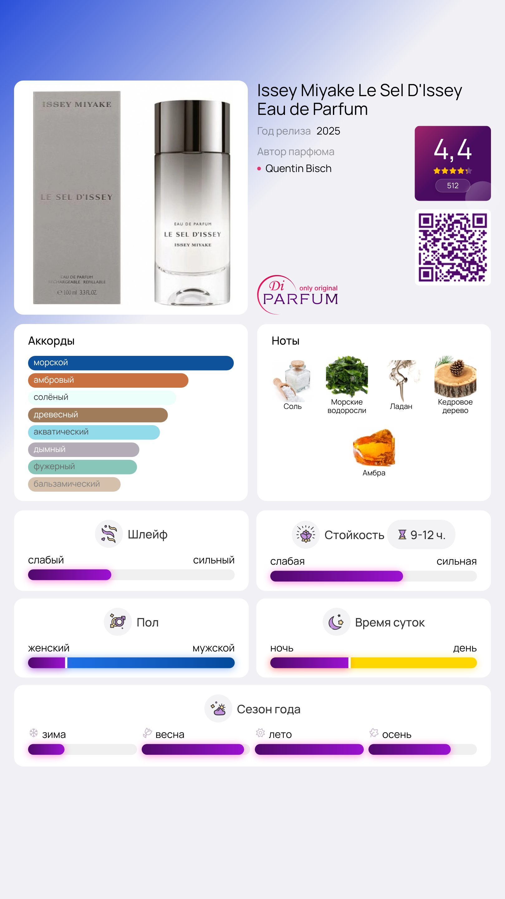 Le Sel D'Issey Eau de Parfum от Issey Miyake — это ароматическая акватическая парфюмерия для мужчин, представленная в 2025 году. Создателем этого уникального аромата является парфюмер Квентин Биш. Верхние ноты сочетают в себе морскую соль и морские водоросли, передавая ощутимую свежесть океанских просторов. В сердце аромата раскрывается таинственный ладан, а завершает композицию тёплое дерево кедра и амбра, создавая глубокий и стойкий шлейф.