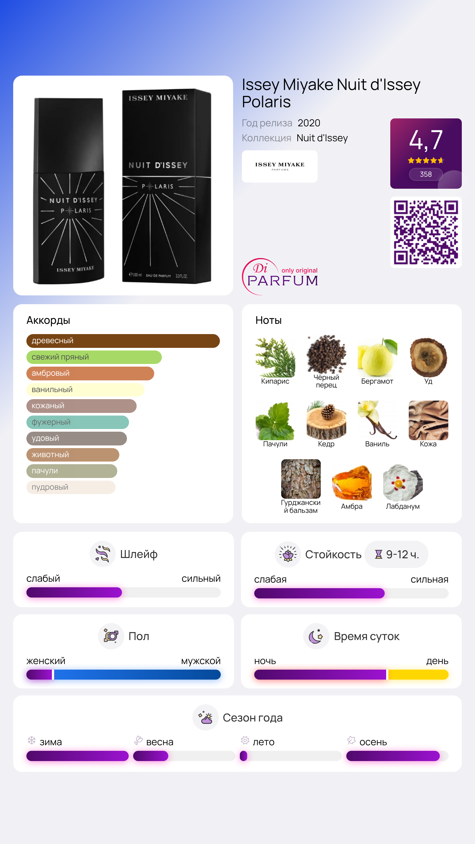 Nuit d'Issey Polaris — это выбор современных и уверенных в себе мужчин, которые стремятся выделиться и оставить след в памяти окружающих. Позвольте себе погрузиться в этот волшебный восточно-древесный мир.