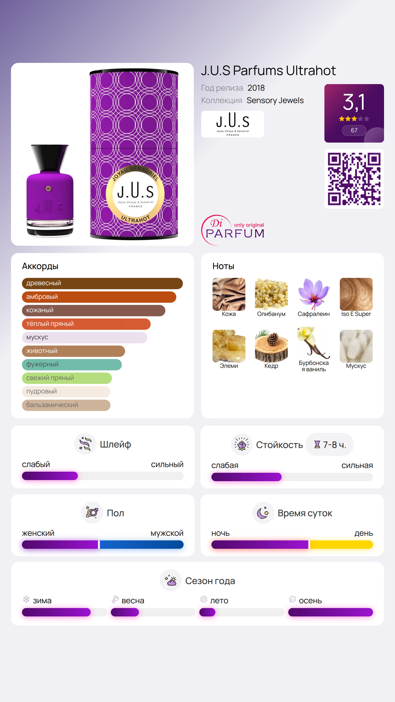Ирис в сочетании с молекулой iso e super добавляют в аромат радостный и насыщенный оттенок, а ваниль и мускус создают прозрачный, но убедительный аккорд. Свежесть и сила Ultrahot от J.U. S Parfums вызывают ассоциации с приключениями – кожаная куртка, мотоцикл и адреналин на пустынной дороге.