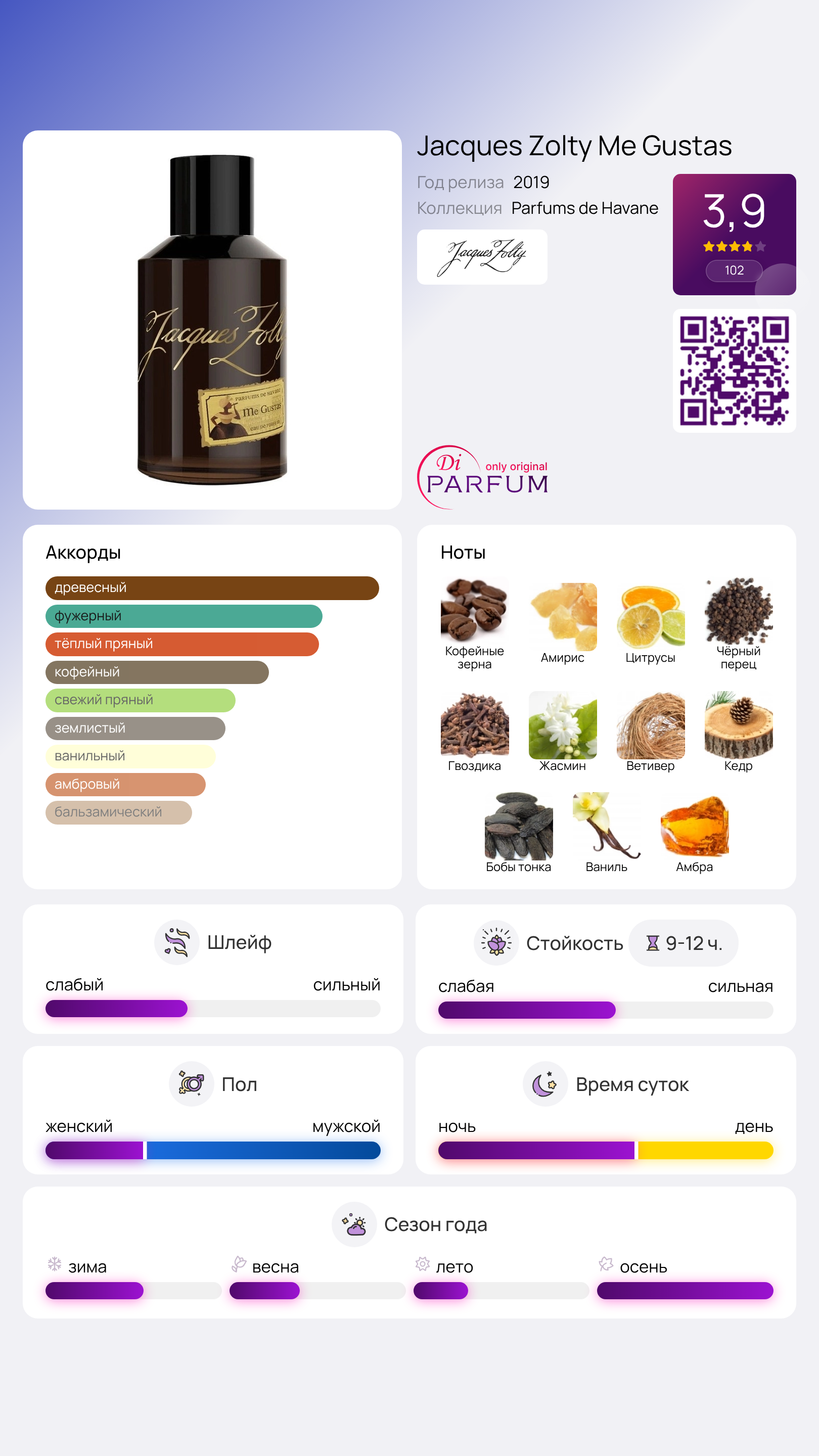 Бренд селективных ароматов Jacques Zolty рад представить свою новую коллекцию парфюмов, вдохновленную Кубой. Одним из ярких проявлений магии этого острова стала композиция под названием Me Gustas: оригинальный восточный букет, где гурманские ноты сочетаются с далекой от гурманики атмосферой. Здесь нет места сладости, ведь даже в чувственном стартовом аккорде с кофе, цитрусовыми акцентами и ароматным амирисом отсутствует элемент десерта. В сердце композиции раскрываются оттенки черного перца, пряной гвоздики и нежного жасмина. Основу парфюма составляют ваниль и тонка-бобы, дополненные белым кедром, амброй и ветивером. Название этого аромата, Me Gustas, переводится как "Ты мне нравишься" - нежные слова, которые, возможно, придут на ум тем, кто открыл для себя мир Jacques Zolty через это необычное творение.