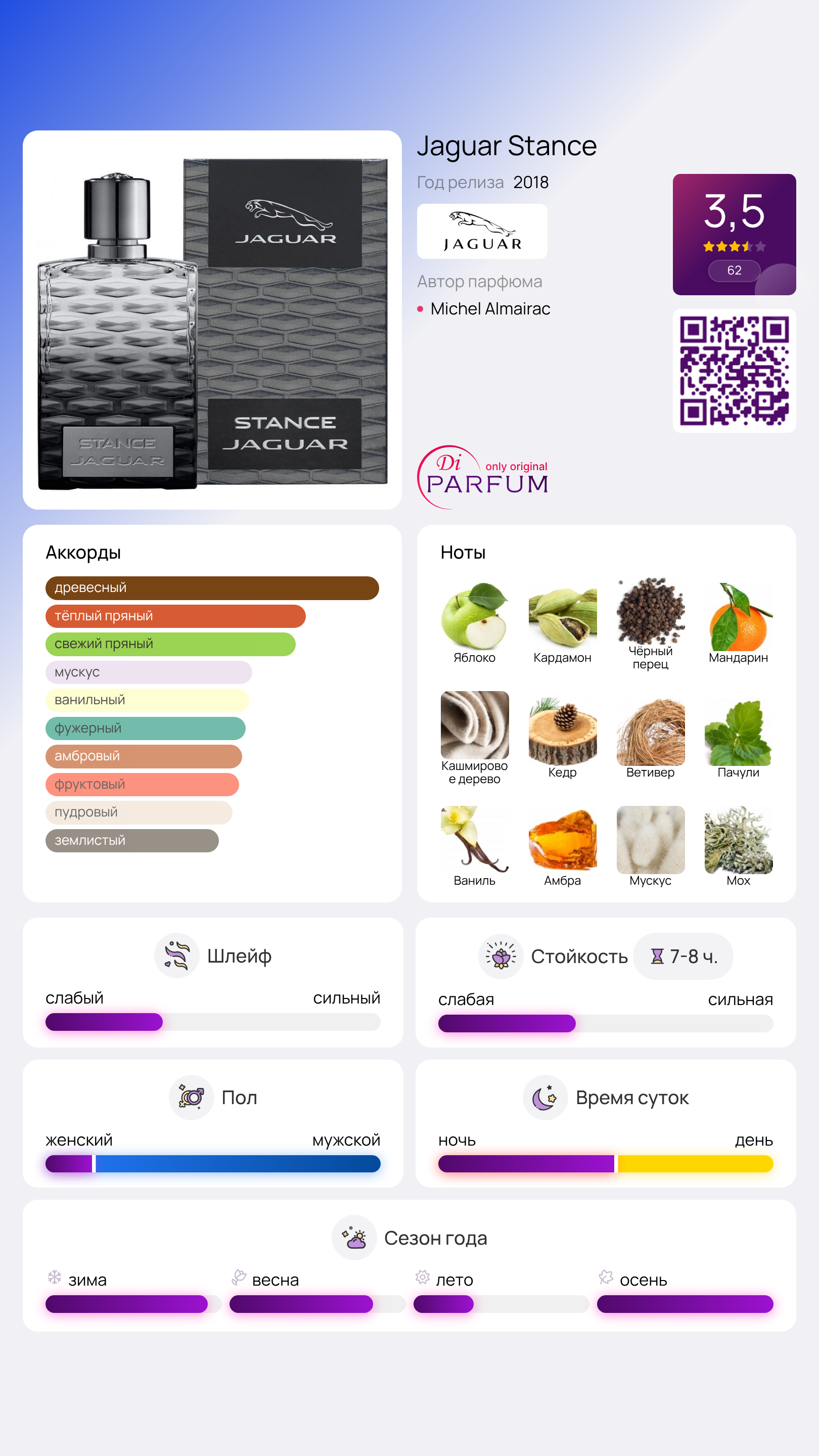 Смелое сочетание специй и древесины в сочетании с ярким мандарином, сладким яблочным соком, пряным кардамоном, острым черным перцем, бальзамическим мускатным орехом создают впечатляющий аромат. Основу парфюма составляют мускус, ветивер, пачули, а в завершении прозвучит теплый ванильный шлейф, объединяющий землистый мох и амбру.