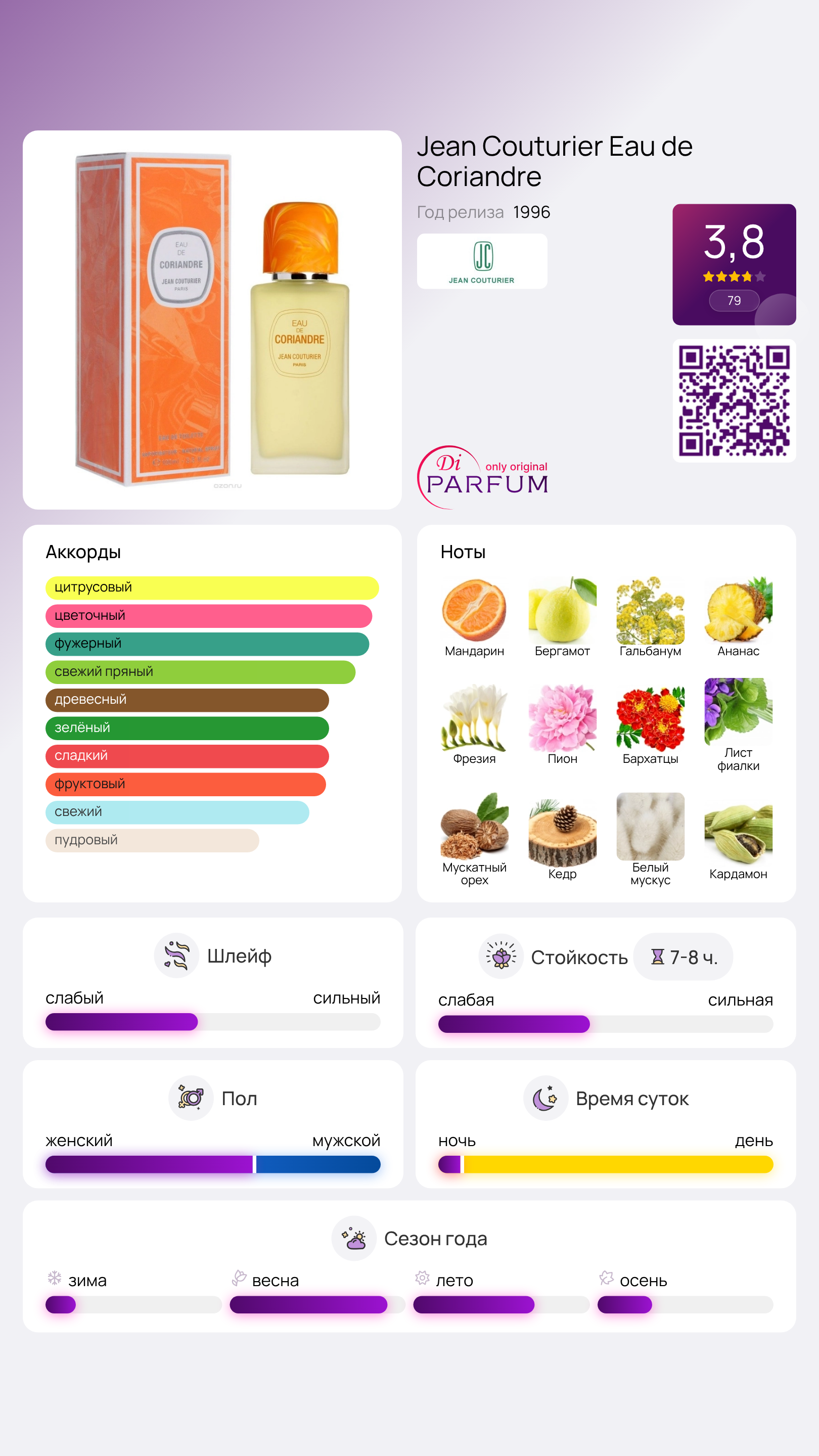 В 1996 году французский бренд Jean Couturier представил аромат Eau de Coriandre, который моментально завоевал популярность благодаря своей оригинальной композиции с ярко выраженным пряным оттенком. Название говорит само за себя – ноты кориандра прекрасно дополняются цветочным аккордом, в котором особое внимание уделено розе. Аромат отличает невероятная мягкость, стойкость и изысканная чувственность, делая его идеальным как для дневного, так и для вечернего использования.