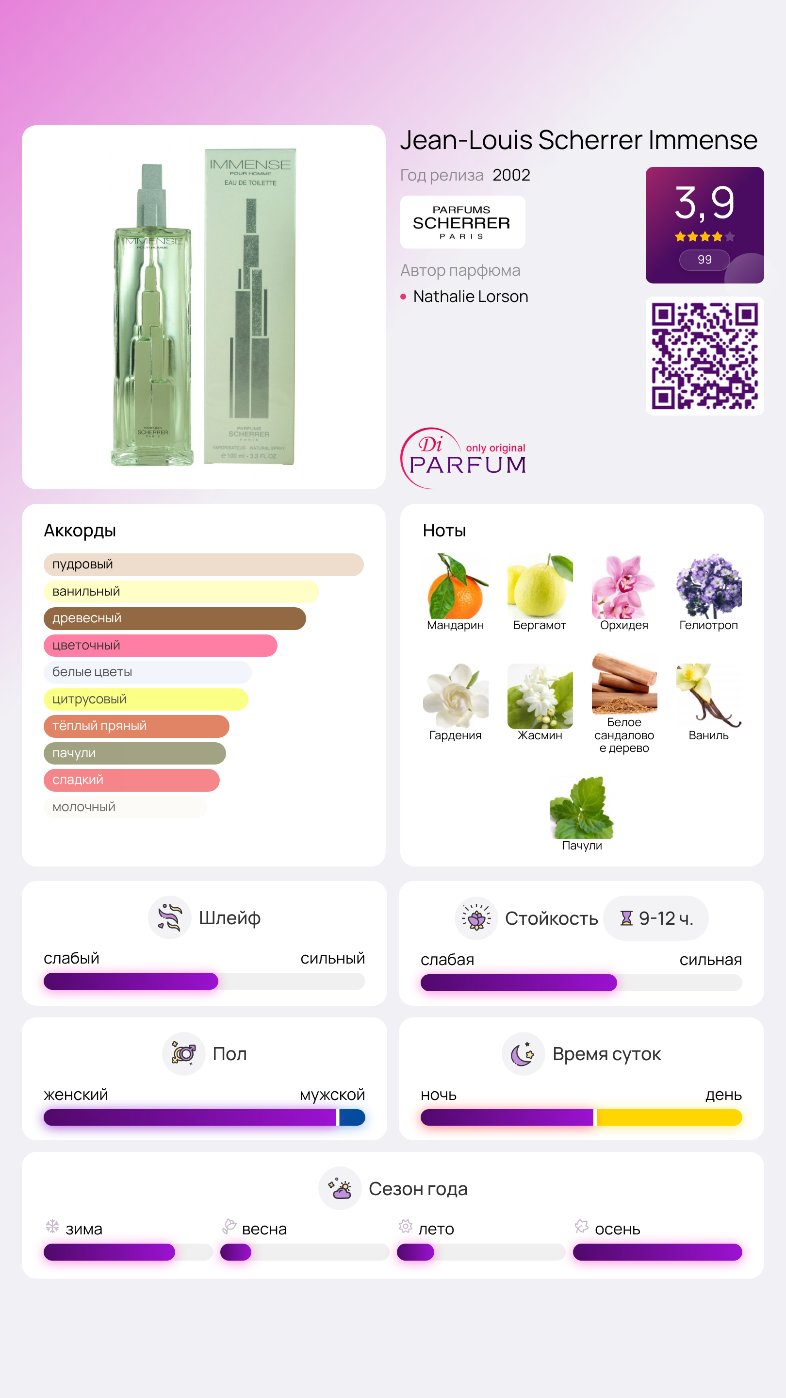 Аромат Immense от бренда Jean Louis Scherrer – это древесно-мшистая композиция, созданная для стильного мужчины, который умеет быть чувственным и динамичным одновременно. Этот парфюм придает ощущение свежести и уверенности на протяжении всего дня благодаря нотам розового перца, фиговых листьев, гвоздики, мха, сандалового дерева, амбры и чилийского табака.