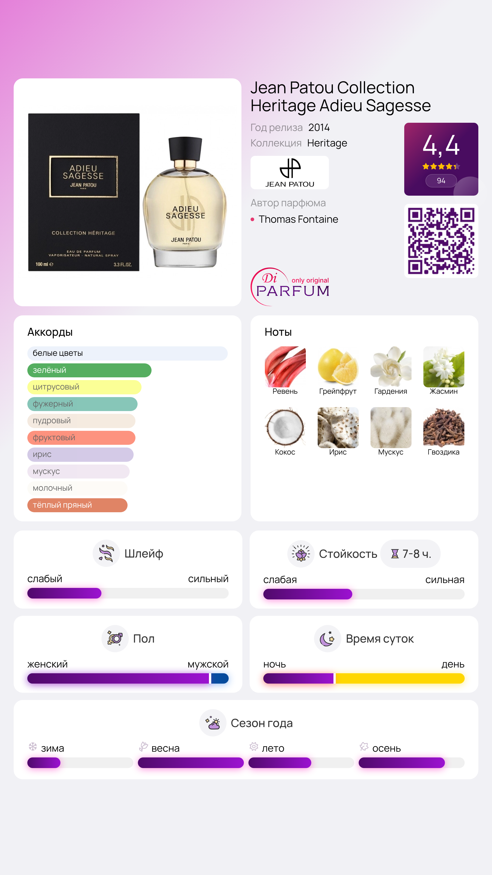 Аромат Heritage Adieu Sagesse может стать отличным выбором для тех, кто ценит богатые цветочные ноты и хочет подчеркнуть свою индивидуальность. Его можно носить как в повседневной жизни, так и на особые события, добавляя вашему образу нотку роскоши.