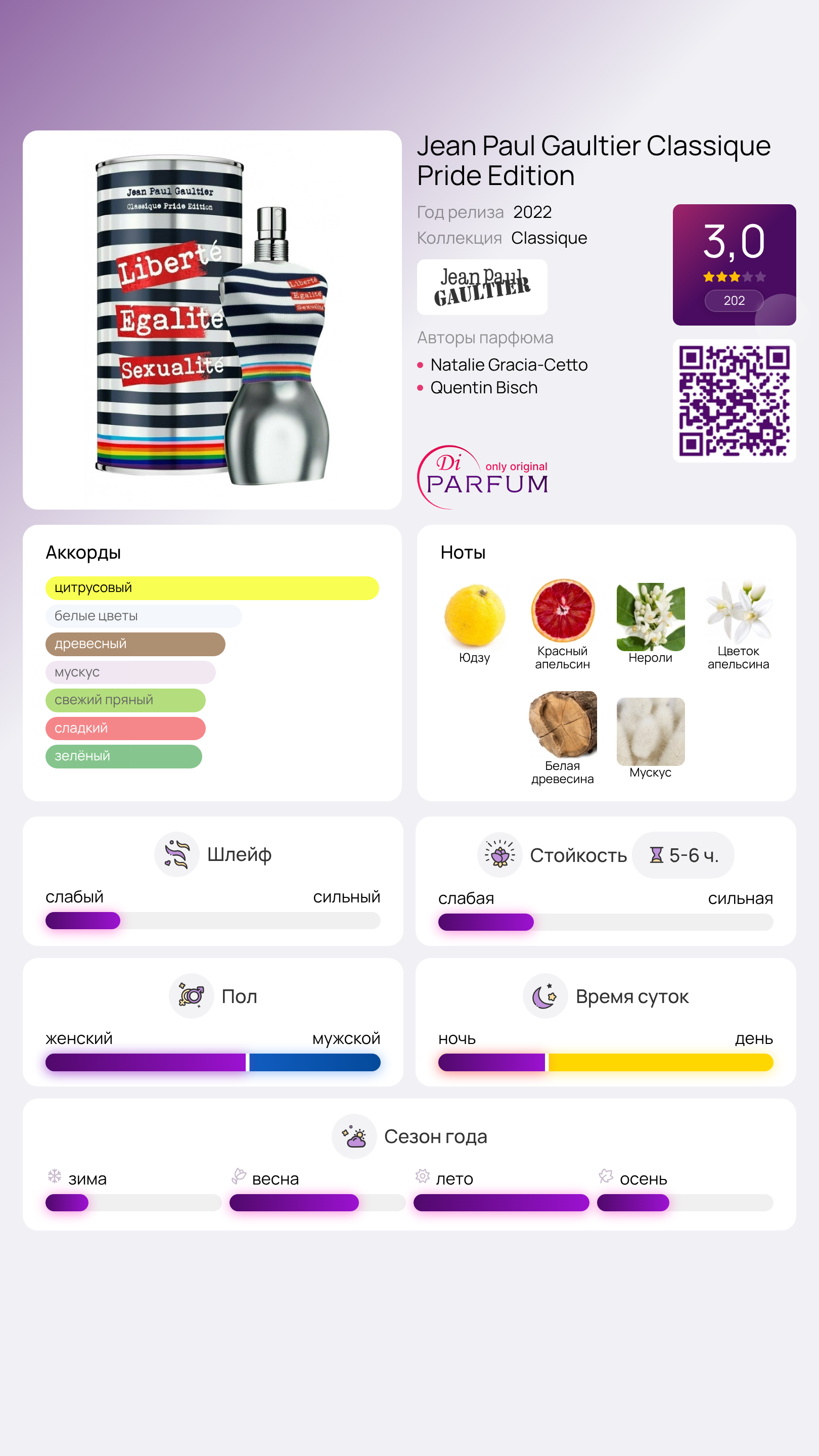 Завершают аромат мягкие оттенки мускуса, совершенно гармонично сочетающиеся с элегантными нотами светлого дерева. Jean Paul Gaultier Classique Pride Edition идеально подчеркивает харизму и неповторимость своей обладательницы, подходя для любого случая – от торжественных мероприятий до романтических свиданий.
