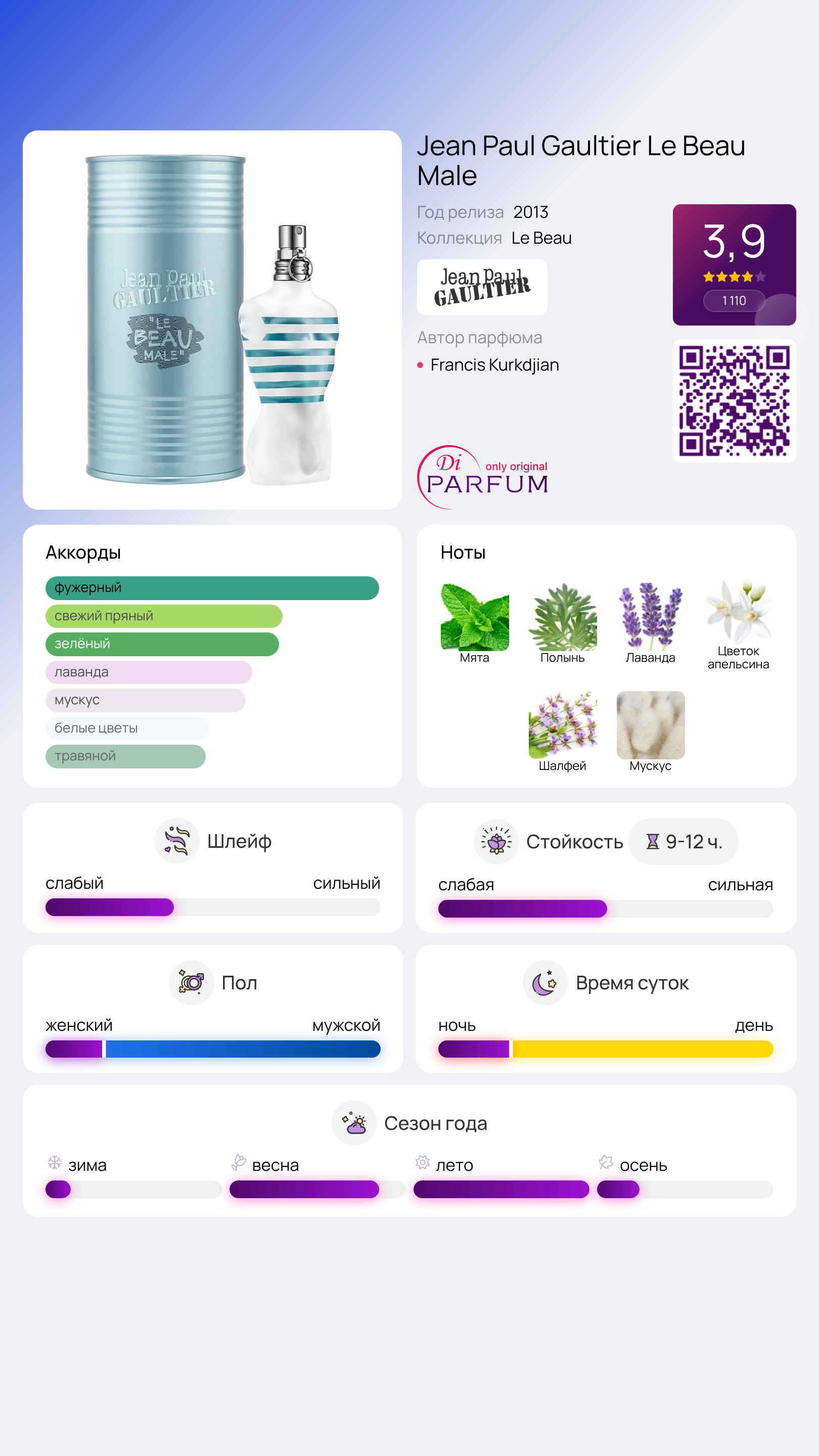 Как только женщина почувствует аромат Jean Paul Gaultier Le Beau Male, в ее сердце разгорится пламя страсти. Словно призыв к соблазну, этот запах увлечет ее на увлекательное путешествие через ноты абсинта и мяты, переходящее в умиротворяющую лавандовую свежесть, наполненную радостью апельсинового цвета. И в тот момент, когда ей кажется, что голова закружилась от страсти, появляются нежные оттенки мускуса и шалфея, принося легкое ощущение прохлады. Дизайн флакона, имеющего форму мужского торса, лишь подчеркивает властность и притягательность тех мужчин, которые уверены в своей привлекательности.