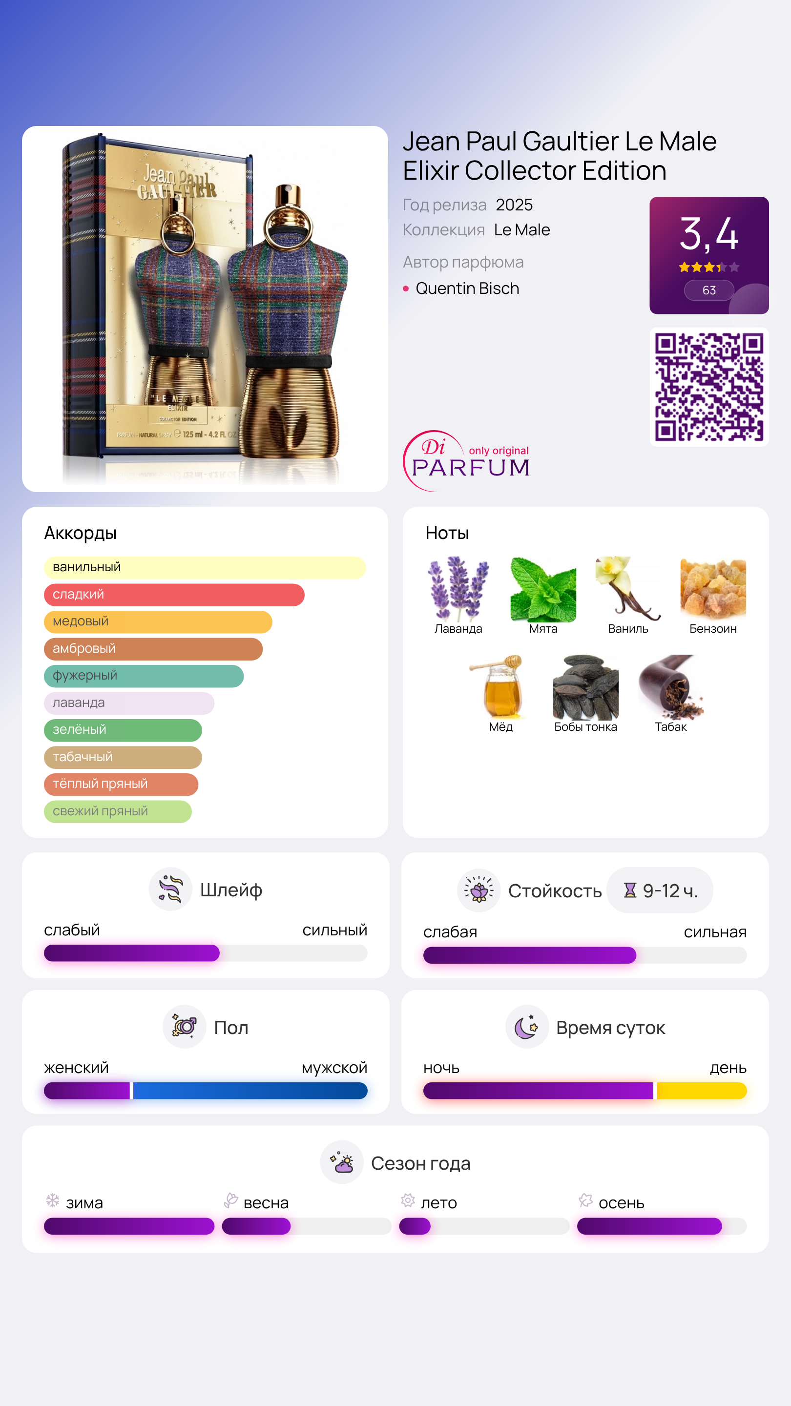 Le Male Elixir Collector Edition от Jean Paul Gaultier — это восточно-древесный аромат для мужчин. Данный аромат стал новым дополнением к линейке Le Male и был представлен в 2025 году. За создание данного аромата отвечает парфюмер Квентин Биш. Верхние ноты открываются свежими акцентами лаванды и мяты, переходя в сердце композиции, где раскрываются сладкие ваниль и смолистый бензоин. Завершают аромат базовые ноты, которые включают мед, бобы тонка и табак.