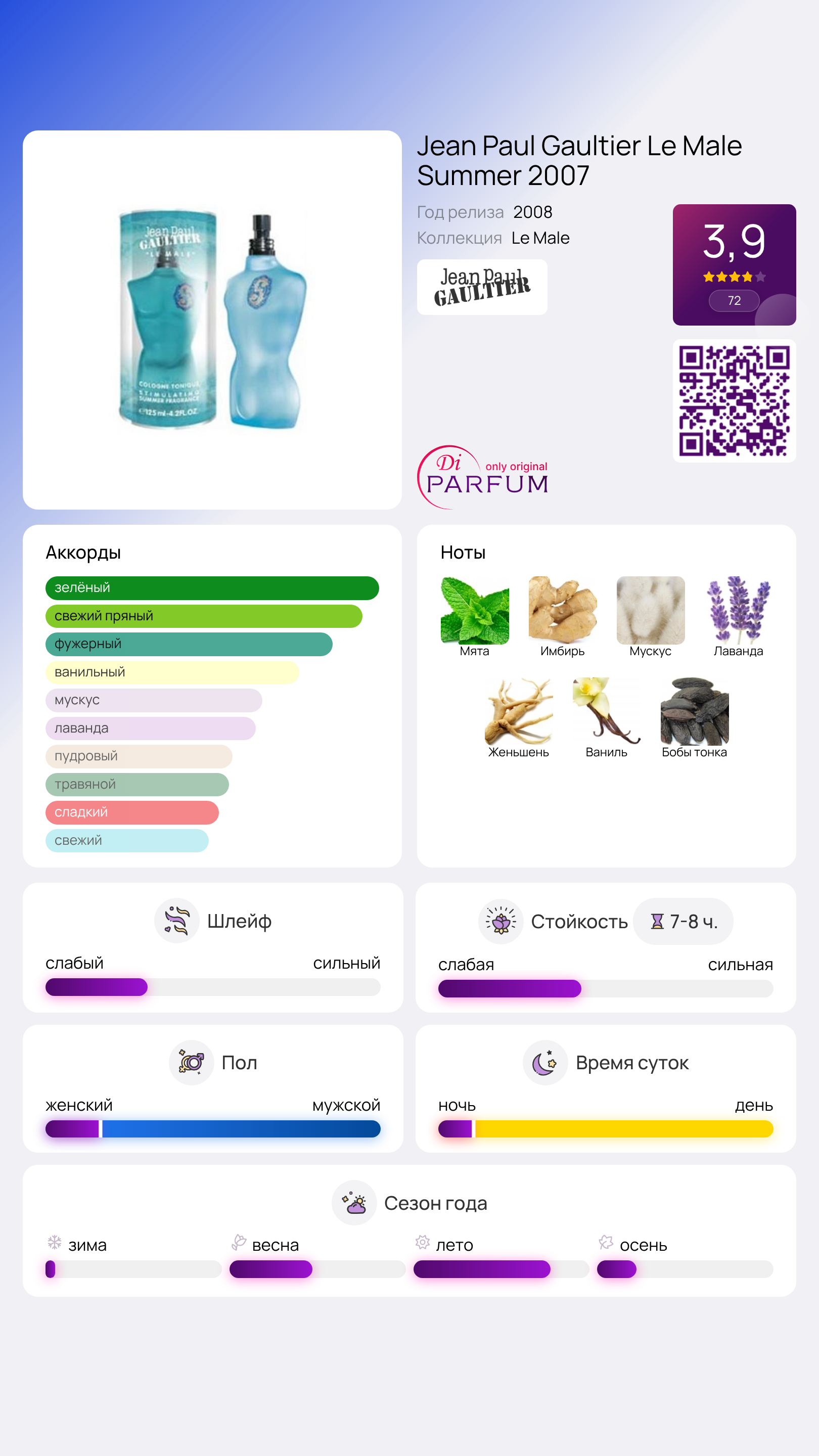 Для тех, кто не любит расти, предназначена летняя версия Le Male Summer 2007 - аромат для тех, кто ценит молодость в сердце. Дизайн флакона вдохновлен яркими принтами из коллекции модного дома Gaultier. Аромат скомпонован из пряных и древесных нот: свежая мята и лаванда, сладкая ваниль и терпкий имбирь, а также древесина с тонким оттенком женьшеня. Le Male Summer 2007 призван подчеркнуть яркий образ и подходит для повседневного использования.