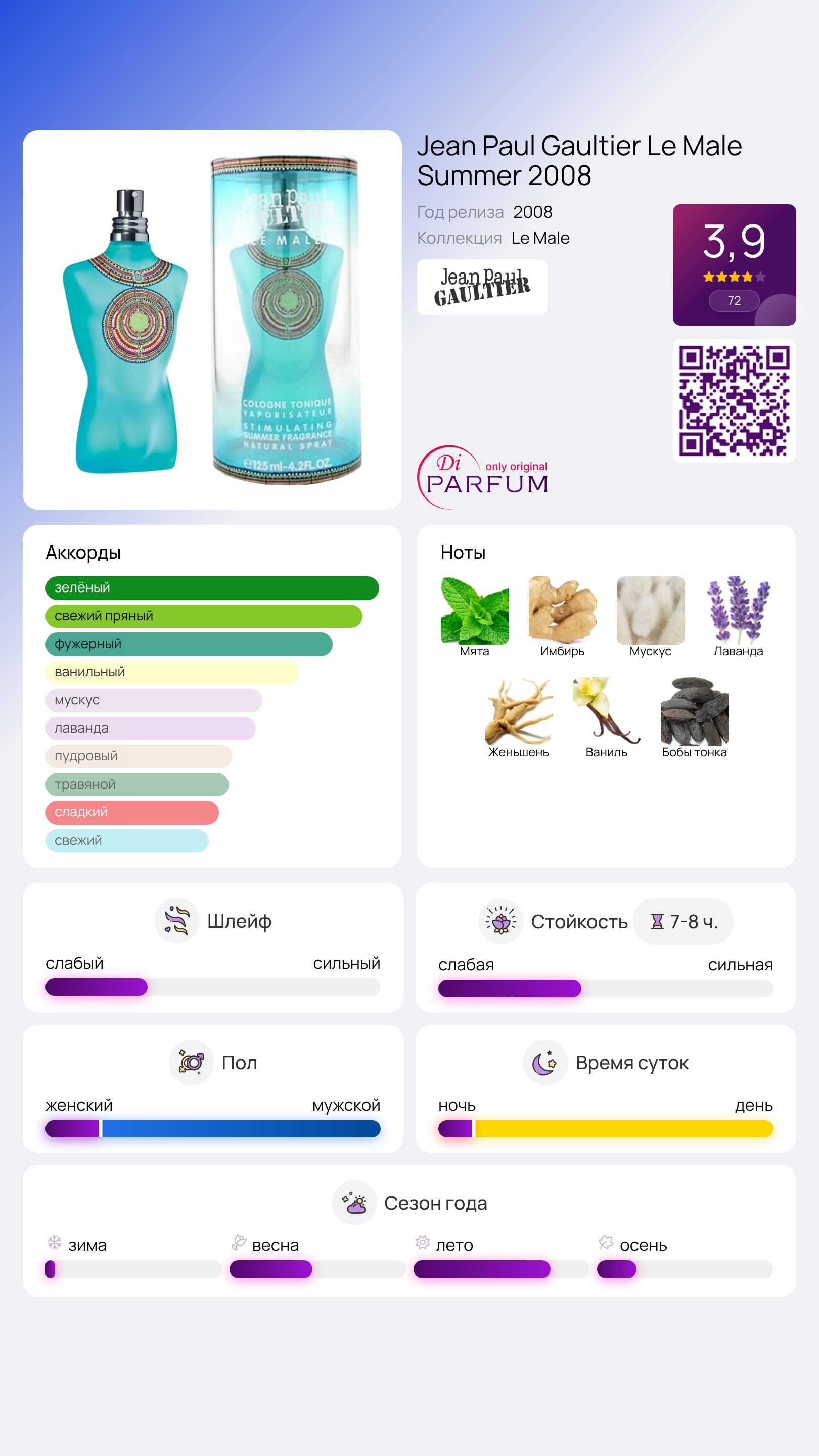 В пирамиде композиции искристые специи сливаются с сочной зеленью и изысканными травяными оттенками. На сердце ощущаются острый имбирь и прохладная мята, сбалансированные ароматной лавандой. Нежные нотки карамели и ванили окружаются дымком тонки и завораживают своей сладостью.
