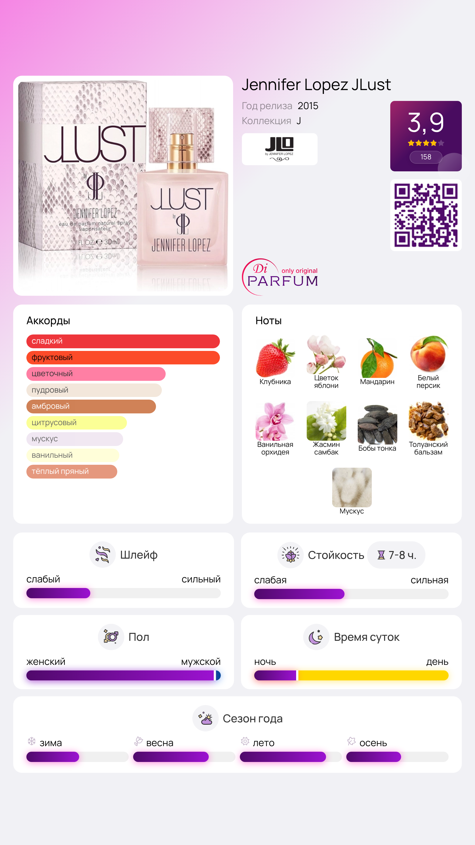 Завершающие ноты в шлейфе аромата включают толу бальзам и дымные бобы тонка, создавая обволакивающий и чувственный аккорд. JLust – это сладострастный аромат, выпущенный американским брендом в 2015 году как часть коллекции JLove. Флакон и упаковка представлены в бледно-розовых тонах с змеиным принтом, что подчеркивает роскошь и соблазн этого аромата