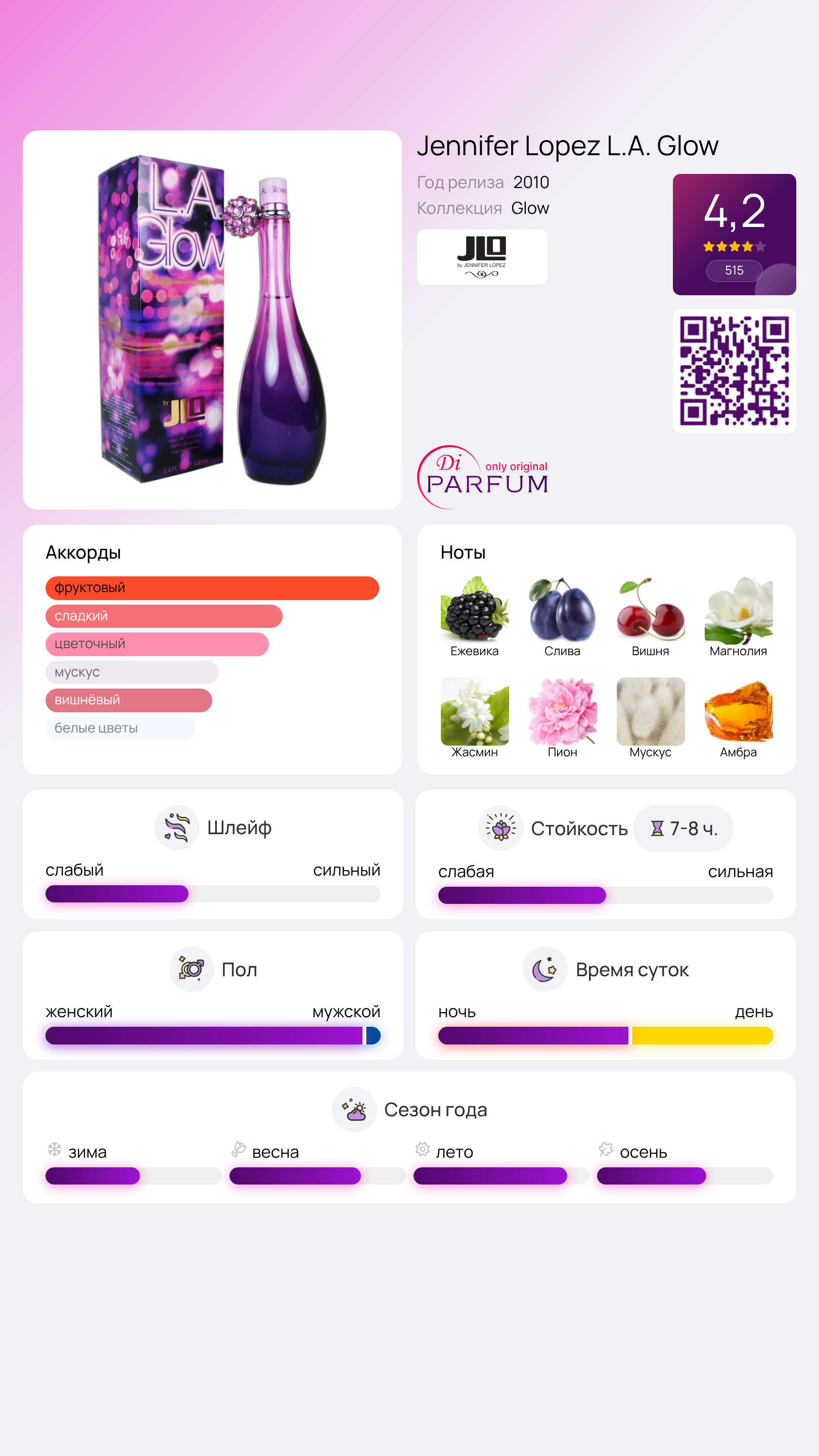 Аромат Jennifer Lopez L.A. Glow создан для современных женщин, которые ощущают себя сексуально и полны энергии, не переставая вести активный образ жизни. Ода ночному Лос-Анджелесу, этот цветочно-фруктовый парфюм символизирует мир неограниченных возможностей и развлечений. Он призван олицетворить веселье и безудержные вечеринки, которые будут длиться бесконечно.