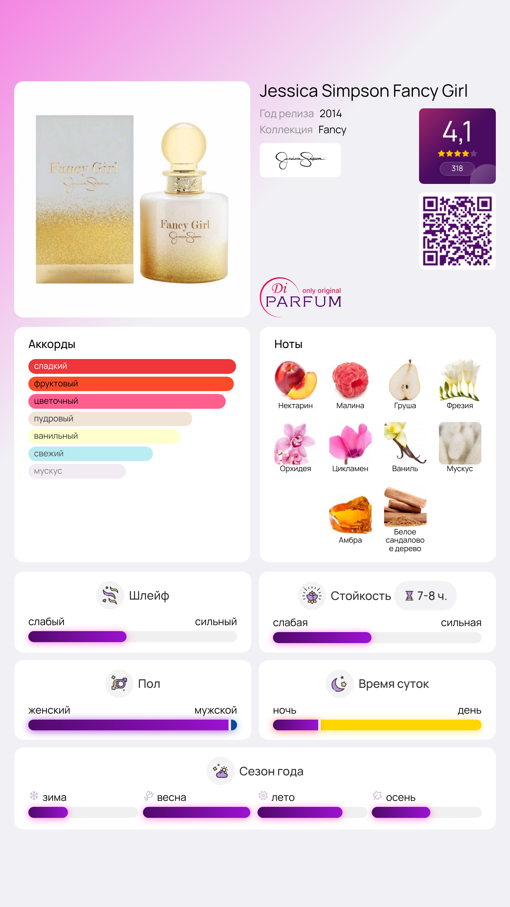 Энергичный и игривый аромат Fancy Girl от Jessica Simpson призван покорить сердца поклонниц цветочно-фруктовых композиций. Представленный в 2014 году, этот парфюм стал популярным среди молодых модниц, украшая их коллекцию ароматов на протяжении нескольких сезонов. Аккорды розовых цветов, спелых фруктов и сочных ягод делают Fancy Girl идеальным выбором для летнего сезона. Нектарин, малина и груша сочетаются в верхних нотах, передавая свежесть и игривость. В сердце борьбу за внимание ведут нежная орхидея, великолепная белая фрезия и цикламен. В завершении раскрываются базовые ноты ванили, сандала, амбры и мускуса, придавая композиции завершенность и глубину.