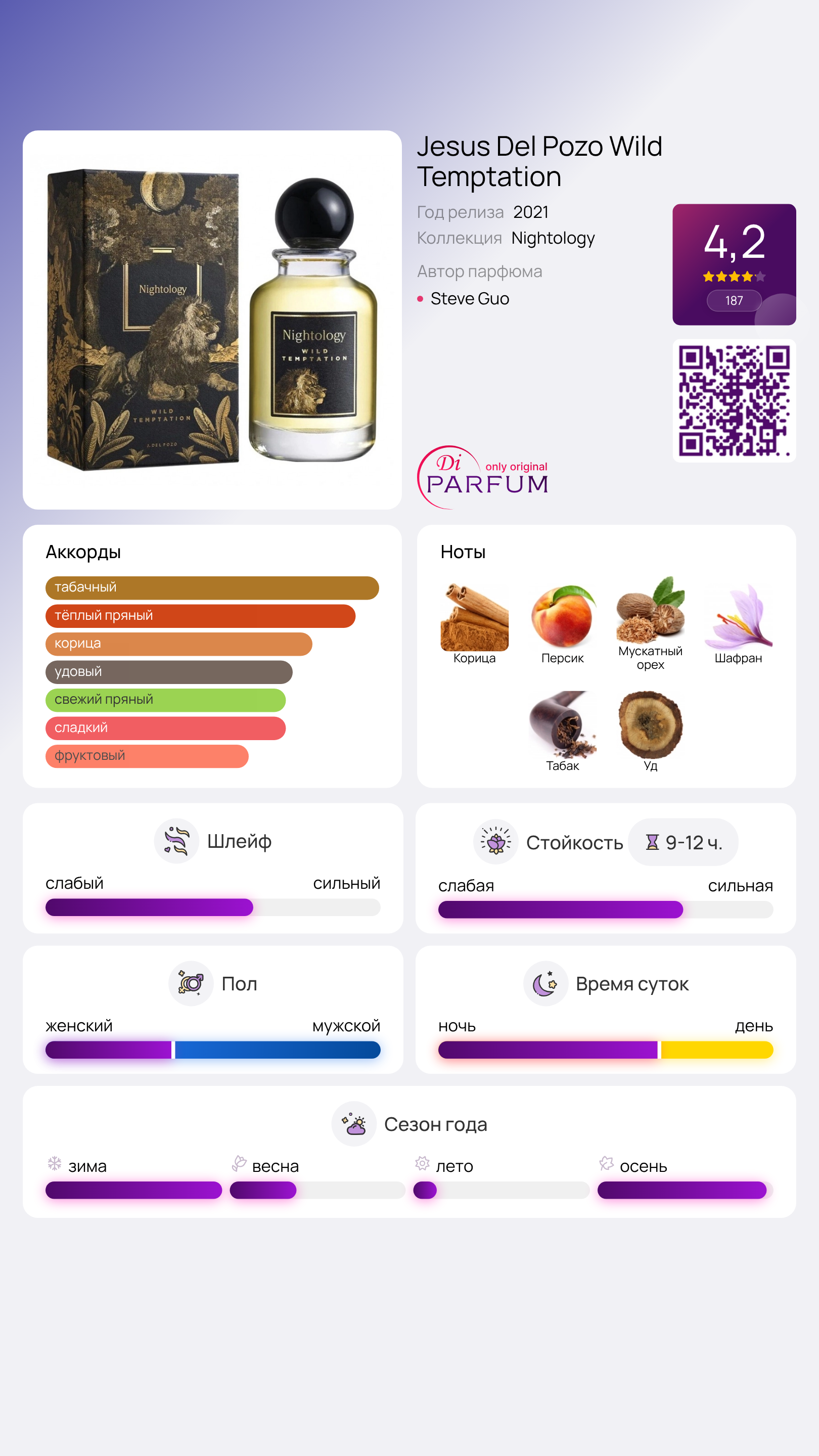 Wild Temptation сочетает в себе яркие нотки корицы и спелого персика на старте, создавая теплое и притягательное начало. В сердцевине аромата раскрываются пряные мускатный орех и шафран, добавляя глубины и загадочности. Завершает композицию выразительный аккорд табака и древесины агарового дерева (уд), придавая парфюму стойкость и насыщенность.