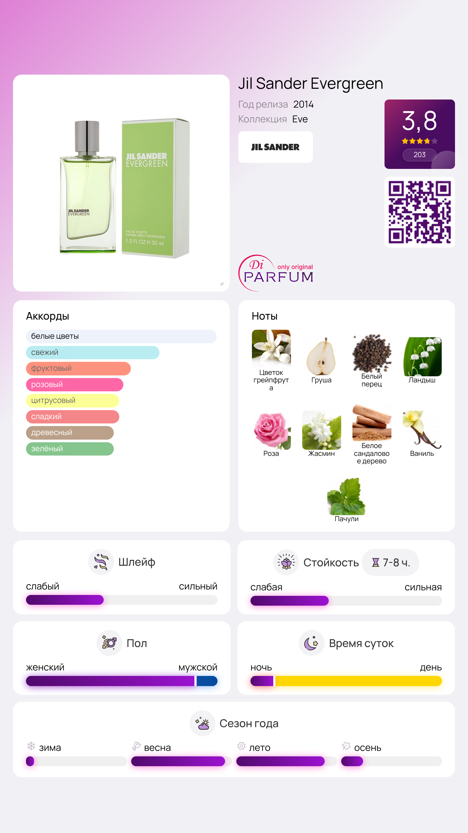 Великолепная "Вечнозеленая" композиция насыщена зелеными травами и белоснежными цветами, открываясь ярким сочетанием грейпфрута и груши. Неповторимый штрих добавляет пряный перец. А в сердце аромата расцветают ароматы цветов, напоенных утренней росой - роза, жасмин и ландыш. Шлейф дополняют древесные ноты сандала и ванили, а также пачули, придающей аромату землистые оттенки.