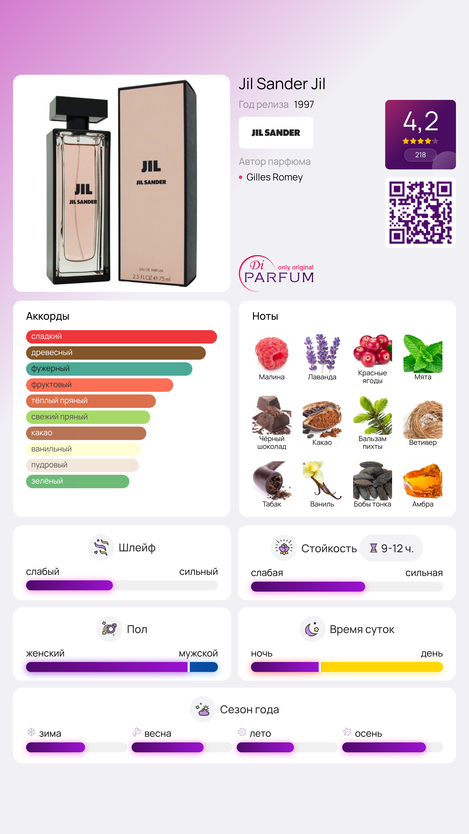 Аромат Jil от Jil Sander принадлежит к категории восточно-цветочных ароматов для женщин. Этот парфюм был выпущен в 2009 году и создан парфюмером Жиль Ромеем. В его композиции звучат ноты мандарина, розового перца и лаванды в открытии, гелиотропа, ландыша и ириса в сердце, а также базовые ноты амбры, мускуса и ванили.