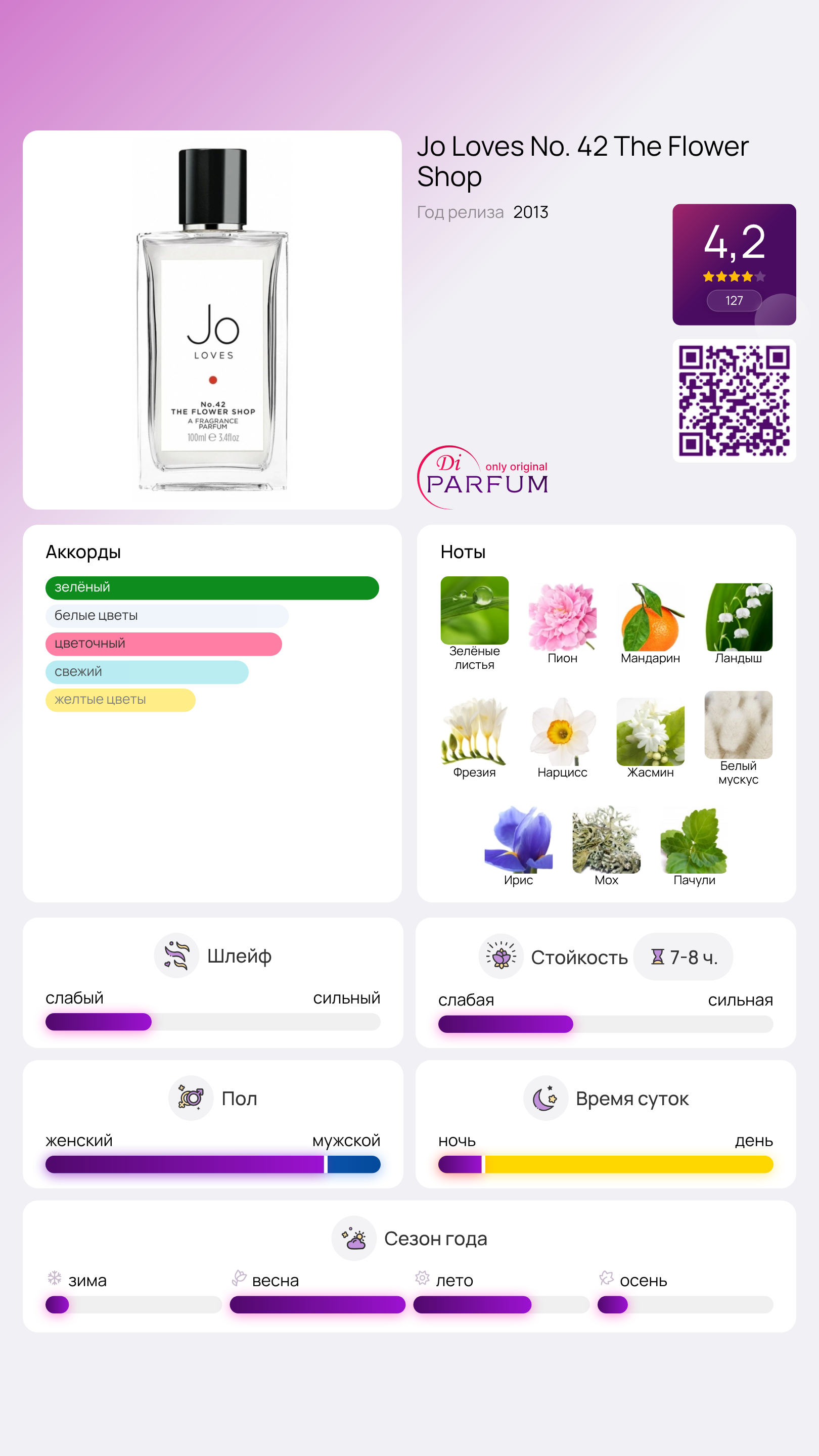 No. 42 The Flower Shop от Jo Loves — это удивительный Floral Green аромат, который подходит как женщинам, так и мужчинам. Выпущенный в 2013 году, этот парфюм олицетворяет собой свежесть и нежность цветочного букета, перенесенного прямо из цветочного магазина.