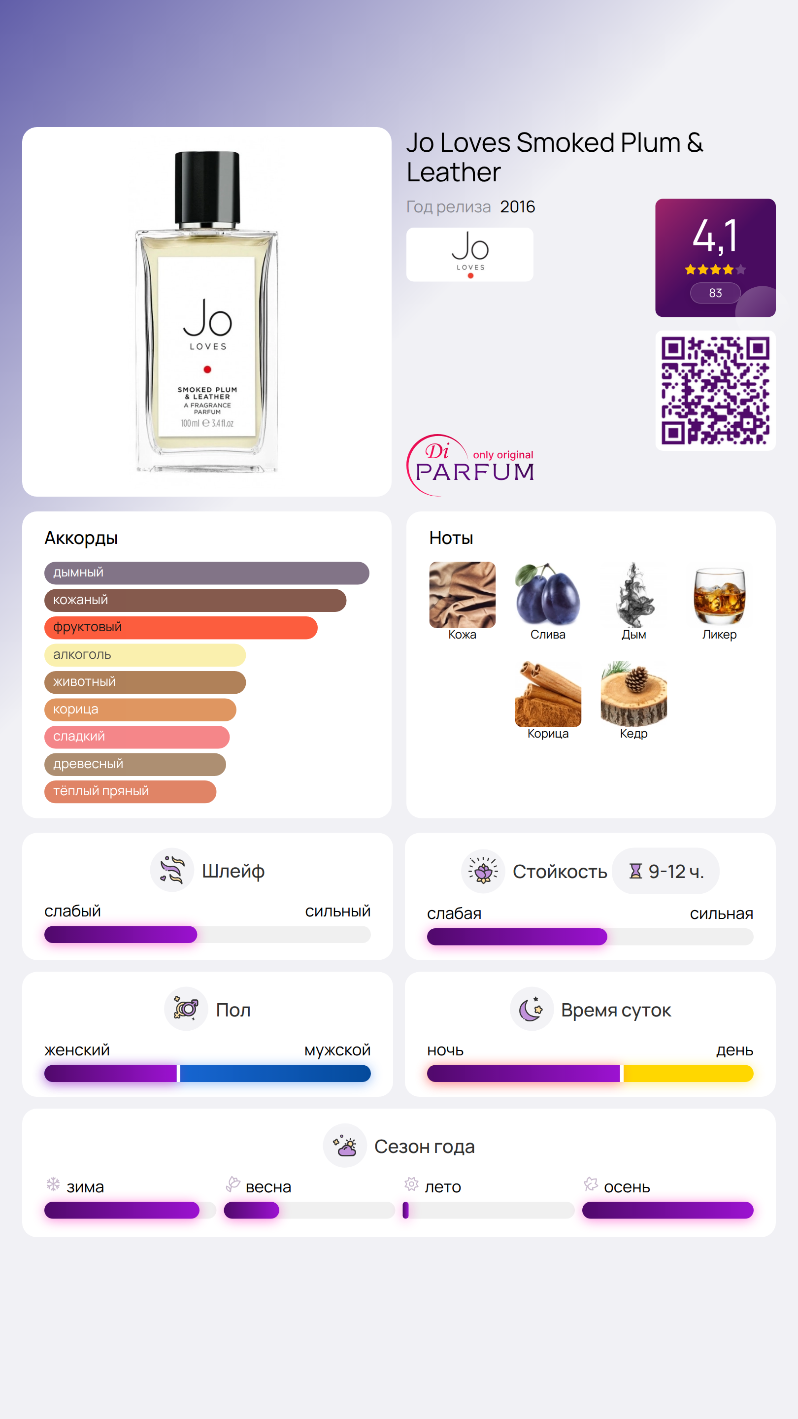 Smoked Plum & Leather от Jo Loves — это уникальный кожаный аромат, созданный как для женщин, так и для мужчин. Выпущенный в 2016 году, этот парфюм находит своё место среди пряных, кожаных и древесных композиций, привнося в мир парфюмерии нечто необычное и запоминающееся.