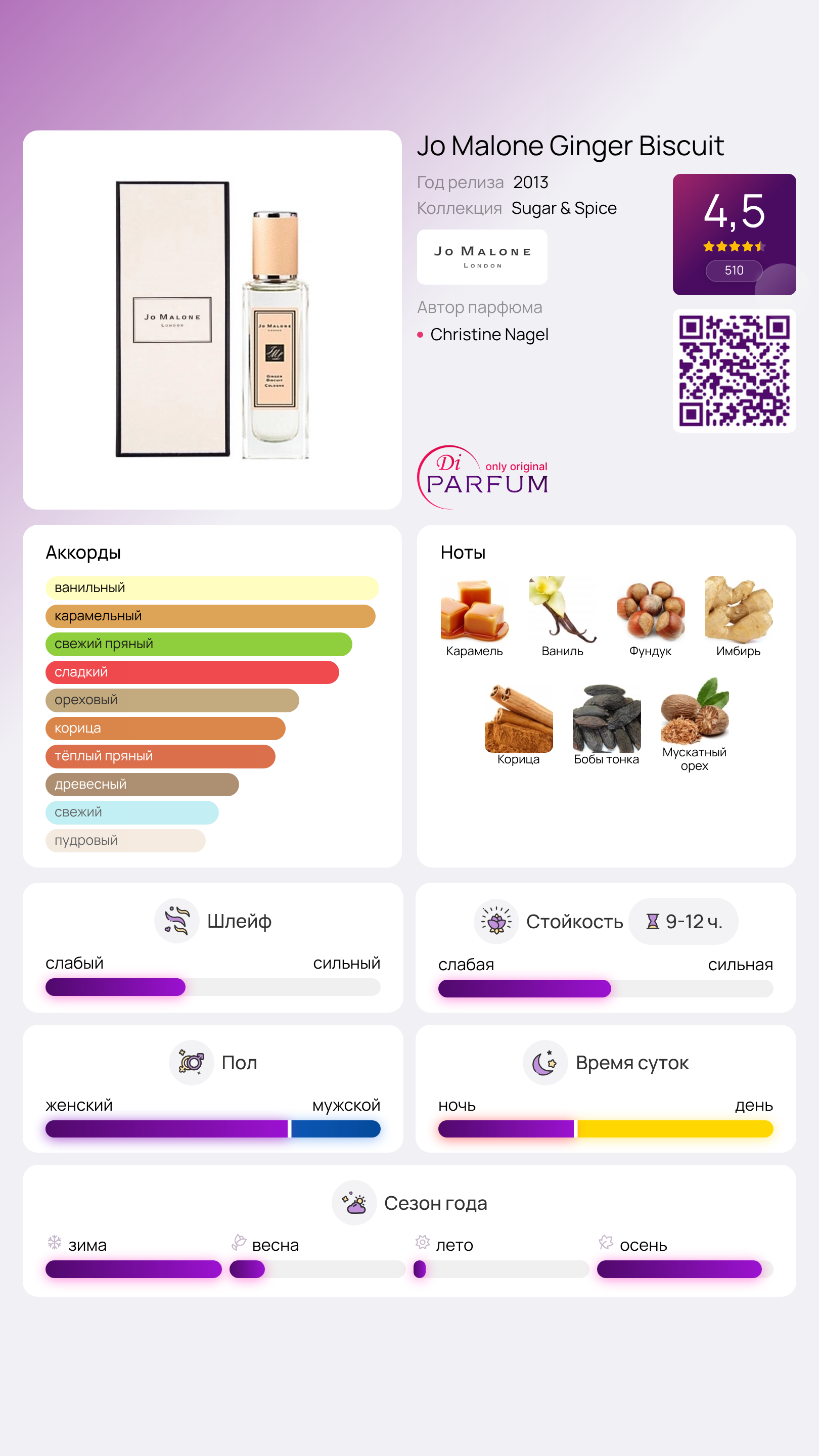 Гурманы по достоинству оценили аромат имбирного печенья - это роскошное лакомство, любимое многими гурманами по всему миру. Известный британский бренд парфюмерии Jo Malone воплощает мечты сладкоежек, выпустив аромат под названием "Имбирное Печенье" или Ginger Biscuit. Естественные нотки имбиря сливаются с запахом хрустящего печенья, обволакивают и радуют не только владельца, но и окружающих своим неповторимым ароматом. Christine Nagel - талантливый парфюмер, создавший этот зимний ольфакторный шедевр, сочетающий в себе ноты имбиря, карамели, ванили, мускатного ореха, корицы, лесных орехов и тонка-бобов.