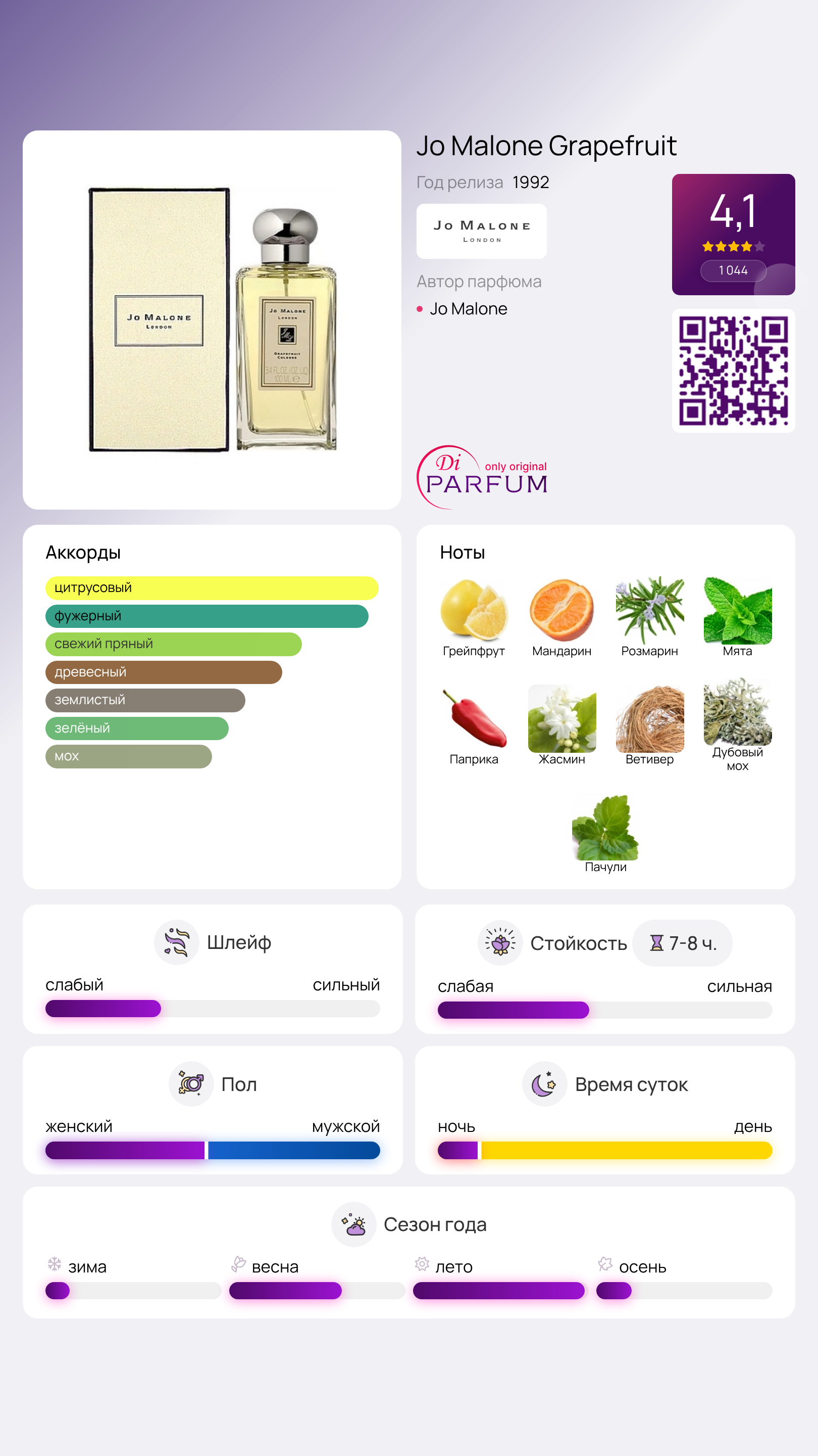 Аромат Grapefruit от Jo Malone возбуждает желания своей яркостью и бодрящими нотками цитрусовых, с пряным оттенком. В нем соединились аккорды грейпфрута, мандарина, ветивера и розмарина, создав неповторимый цитрусовый лад от утренней прогулки до вечернего коктейля. Начальные ноты парфюма окутывают свежесть грейпфрута и мандарина, а аромат переходит в пряно-цветочное "сердце" с мятой, розмарином, жасмином и красным перцем. В древесном шлейфе раскрываются ноты пачули, ветивера и мха.