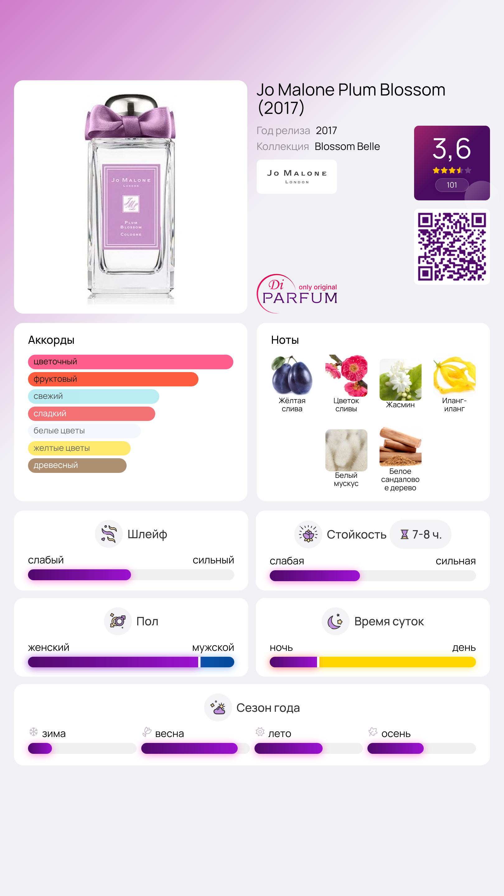 Весенний период – время, когда деревья расцветают лишь на несколько дней, но успевают наполнить воздух своим чарующим ароматом. К сожалению, вскоре этот прекрасный запах останется лишь в памяти. Такой же натуральный и уютный, как и аромат Plum Blossom от Jo Malone, оказывается плодово-цветочный шедевр английского бренда. Парфюм раскрывается нотами спелой сливы, которые затем сменяются иланг-илангом, жасмином и доминирующим цветочным аккордом сливы. А чтобы мелодия прозвучала еще дольше и сохраняла свою стойкость, авторы добавили в базу ноты мускуса и сандала.