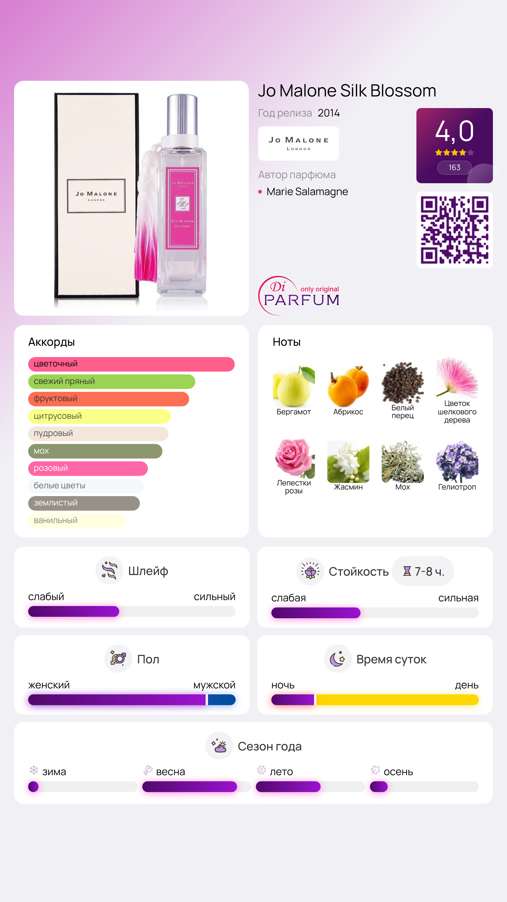 Духи Silk Blossom созданы для смелых и уверенных женщин. В их композиции сочетается утонченный аккорд цветов, пряностей и фруктов. Сладость абрикоса сбалансирована острой ноткой перца, нежным жасмином и розой. Букет дополняют мягкие аккорды мха и ванили. Этот парфюм отлично подойдет для любого времени года. Выделите свою индивидуальность вместе с Silk Blossom!