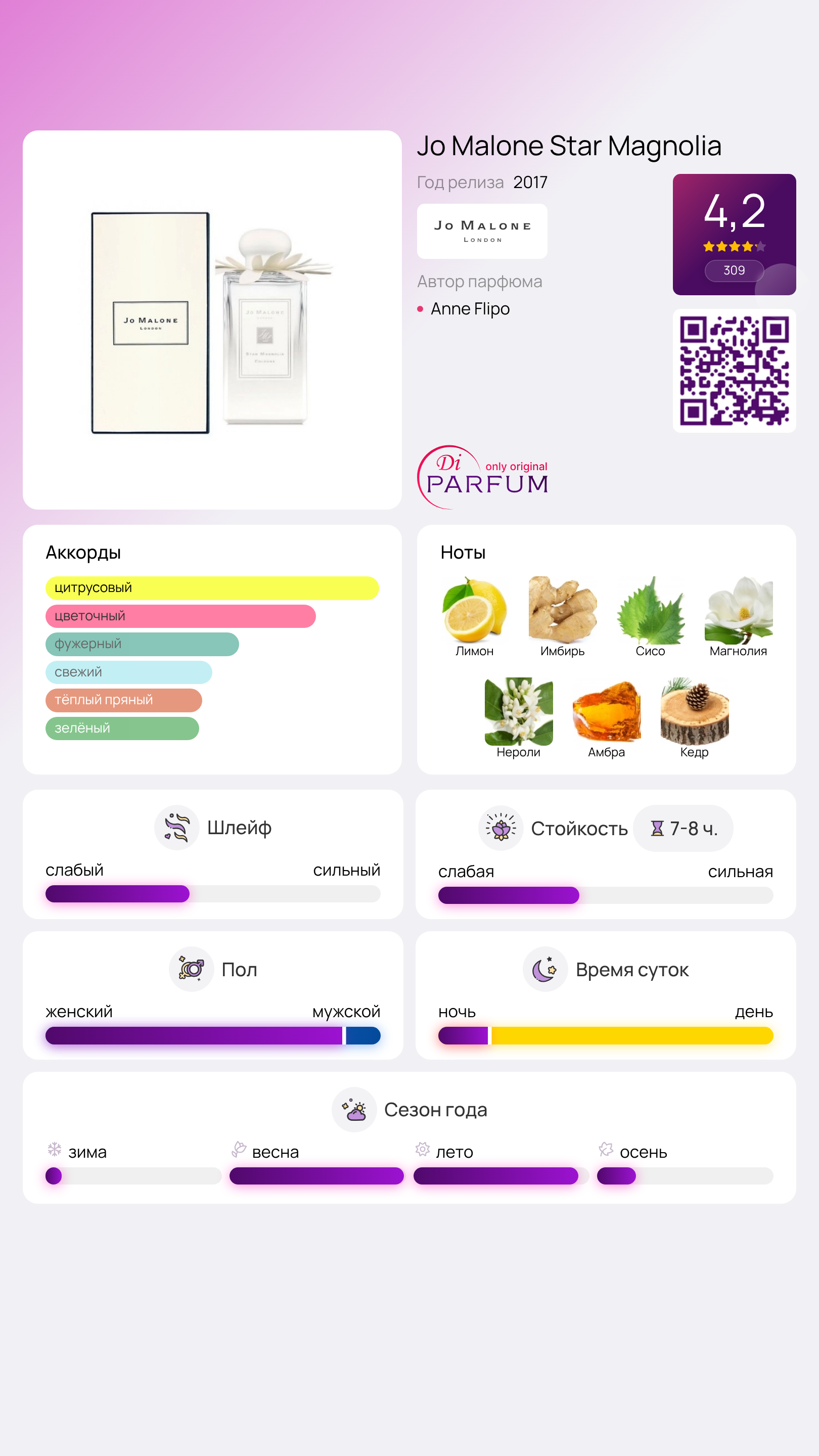 Если вы любите неповторимый запах магнолии с тонами фруктов, зелени и цветов и хотели бы его еще раз почувствовать, порекомендовали бы обратить внимание на женский парфюм Star Magnolia от Jo Malone. Этот аромат из цветочной категории представлен в уникальном флаконе, который отражает красоту магнолии, и был выпущен в 2017 году. Создателем этого шедевра стала Anne Flipo. После начальных нот шизо, имбиря и лимона, которые сразу же бросаются в нос, Magnolia Stellata, известная также как "звездчатая магнолия", раскрывает свой аромат в сочетании с нероли. Белый кедр и амбра создают завершающий аккорд этой изысканной композиции.