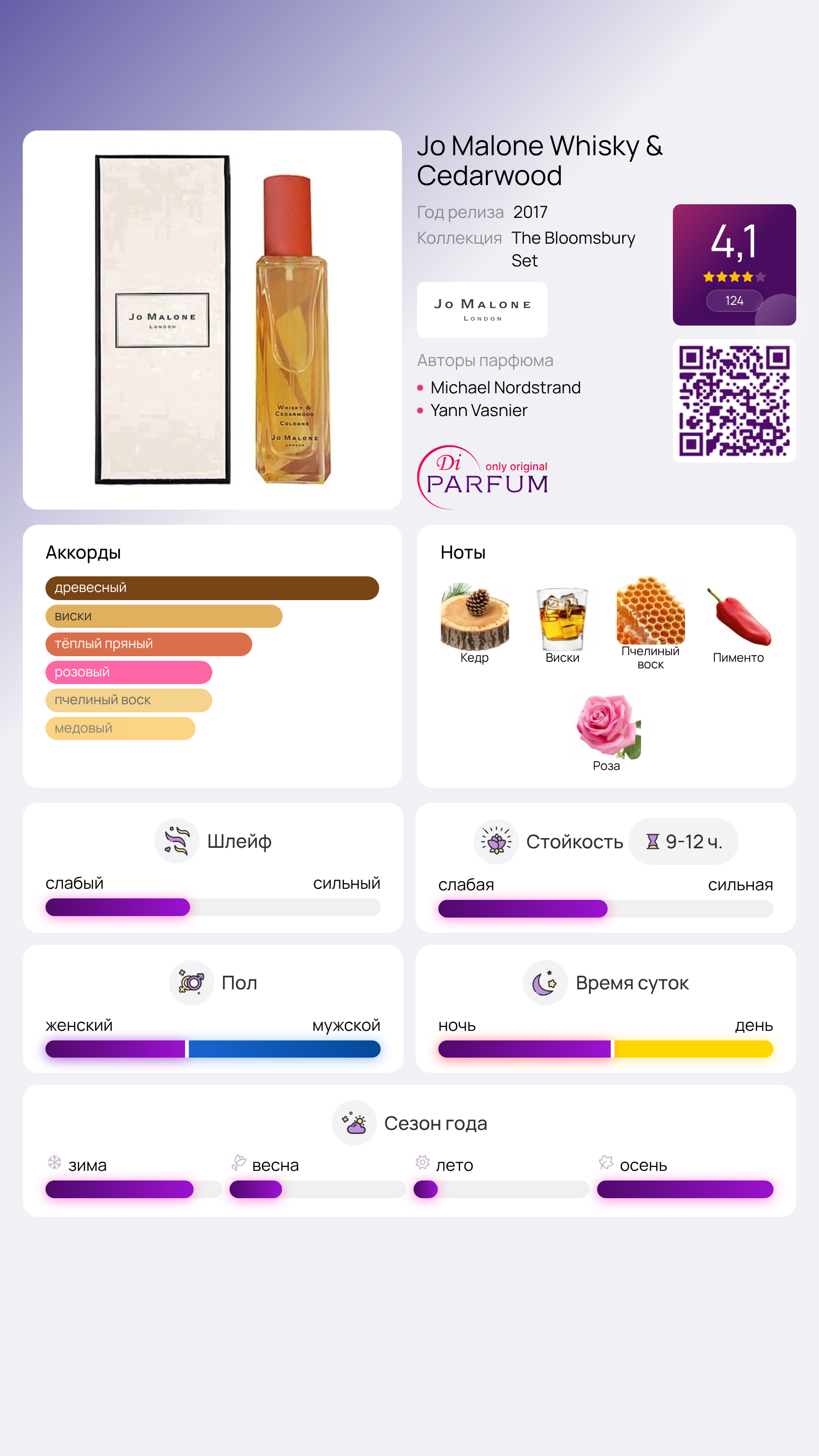Аромат Whisky & Cedarwood из коллекции The Bloomsbury Set от Jo Malone выделяется своей насыщенностью и стойкостью среди прочих. Отличие в этом не случайно - за него стоят опыт и талант парфюмера Янна Васние, который сочетает ингредиенты с умением. В составе аромата присутствуют виски, белый кедр, роза, красный перец и неповторимый аромат натурального пчелиного воска, создающие уникальное настроение.
