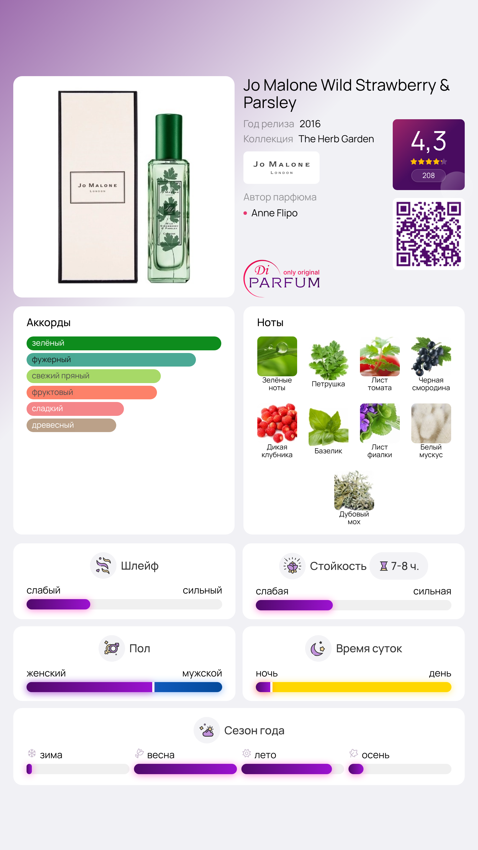 Парфюм сочетает в себе свежесть сочной петрушки, оттенки томатных листьев и фруктовые нюансы вина. В начале аромата зазвучат ноты черной смородины, а в центре раскроются ягодный аккорд клубники и легкий шлейф фиалки. В основе этого букета присутствует явное дыхание зеленого мха, придающее аромату особую глубину.