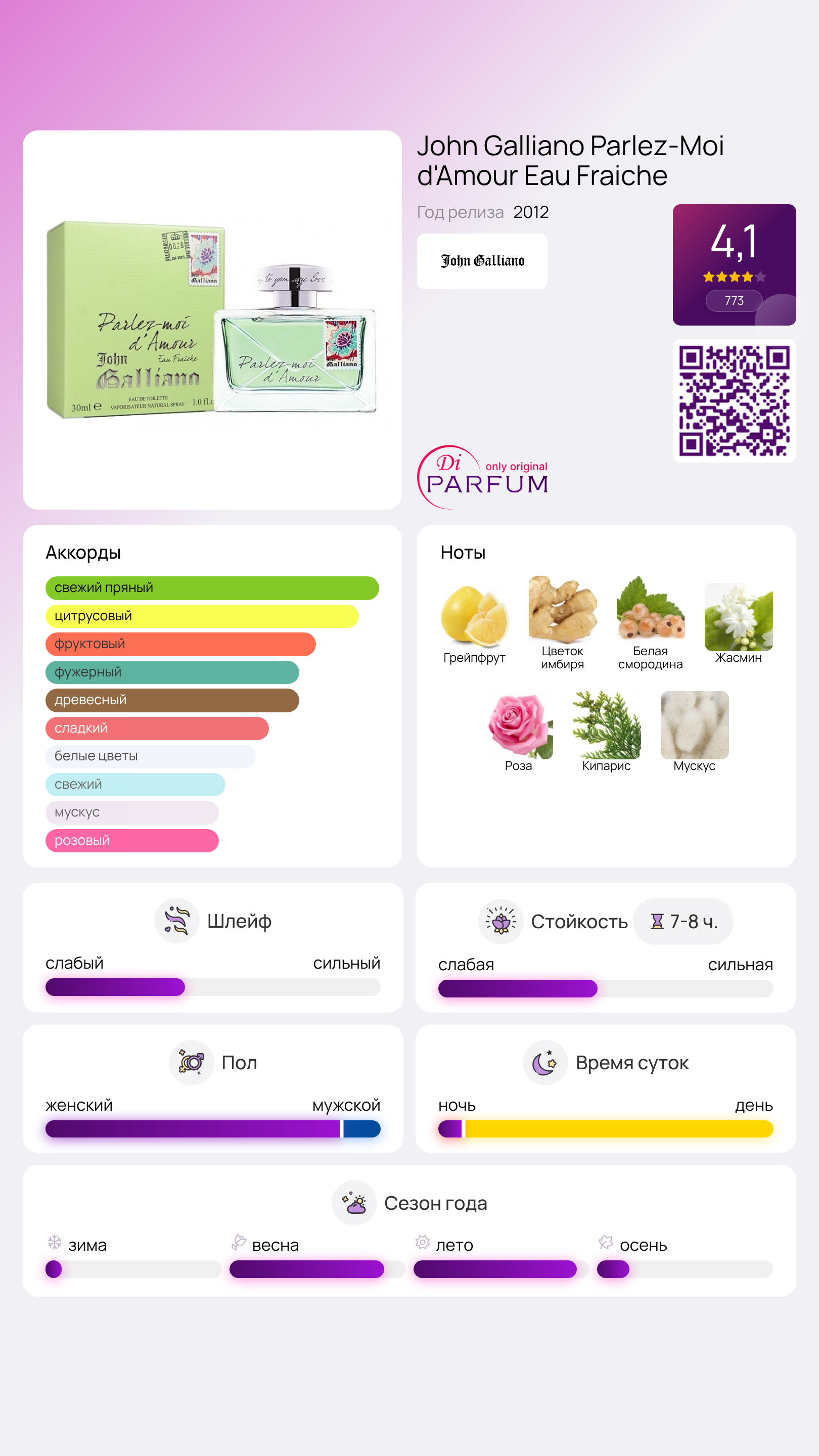 Создание Джоном Гальяно нового аромата «Parlez-Moi d’Amour Eau Fraiche» стало выражением его свежих чувств и эмоций. Если в прошлом году вы уже наслаждались ароматом розового конверта, то сейчас можно погрузиться в мир юной девушки, игривой и соблазнительной, и, возможно, даже влюбиться! Этот аромат был выпущен в 2012 году и предлагает новое восхищение своими нотами.